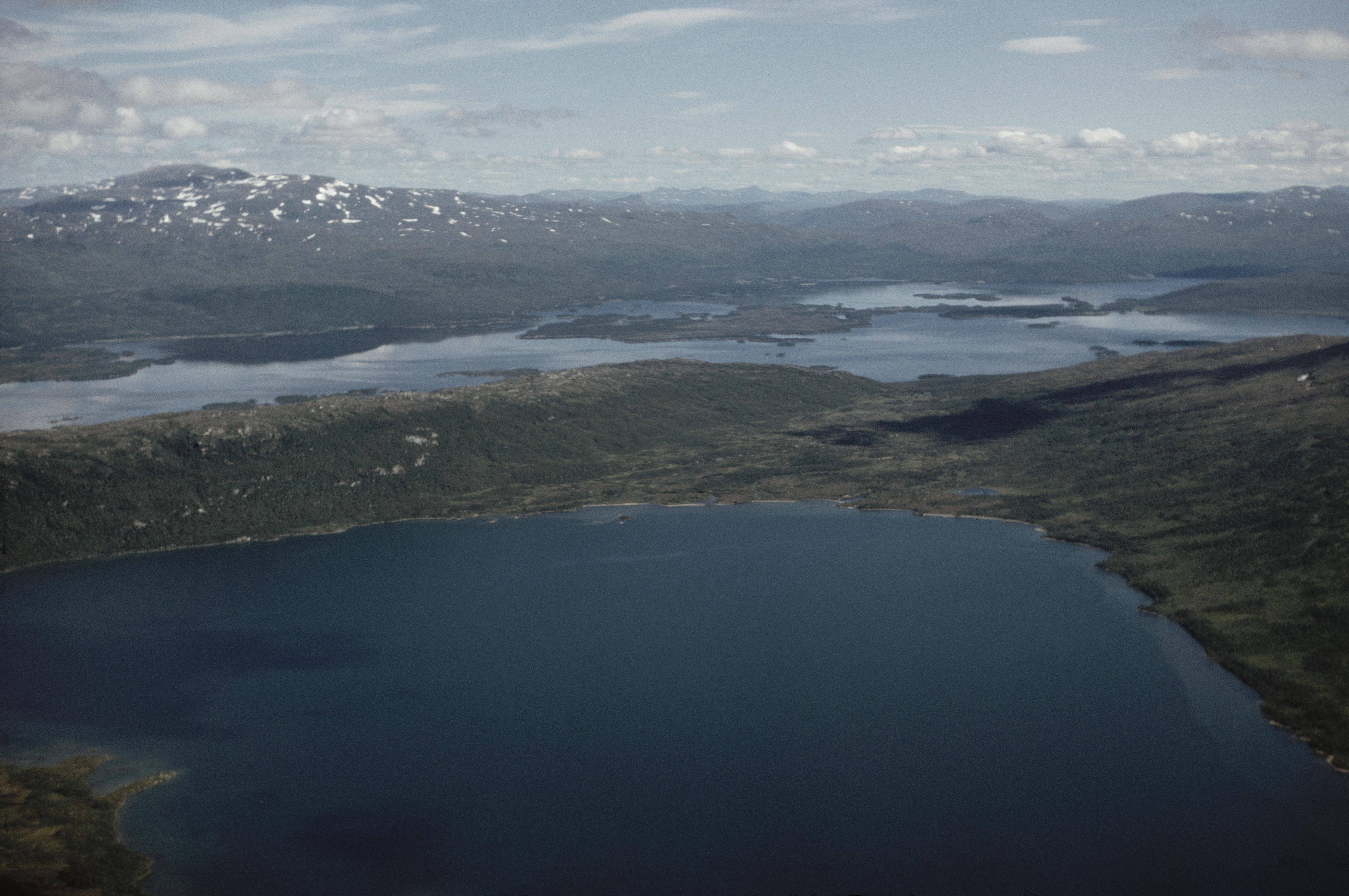 Beskrivning: Längs bildens nedre kant går gränsen mellan Sverige - Norge (udden nere till vänster är i Norge). Boplats RAÄnr Tärna 77:1 m.m. vid stranden till höger över bildens mitt. Över bildens mitt Fjällripfjället (Stråmhpoe) mot sjöarna Över-Uman (Jillemes Upmeje) och Gaske Upmeje. Bilden är tagen mot (väderstreck): Ö