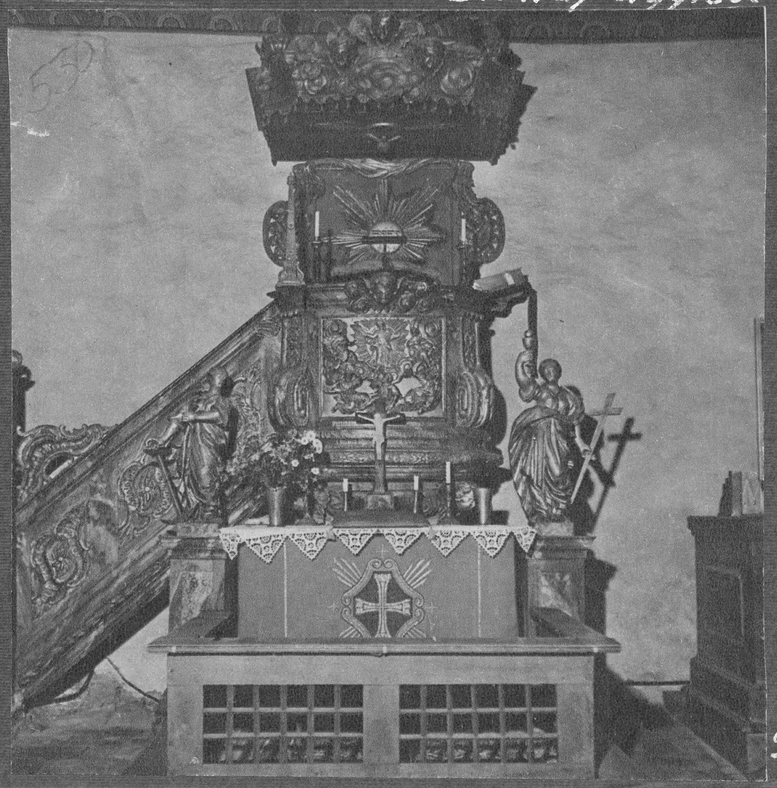Beskrivning: Koret mot öster. Altaret och predikstolen. Efter restaureringen.
