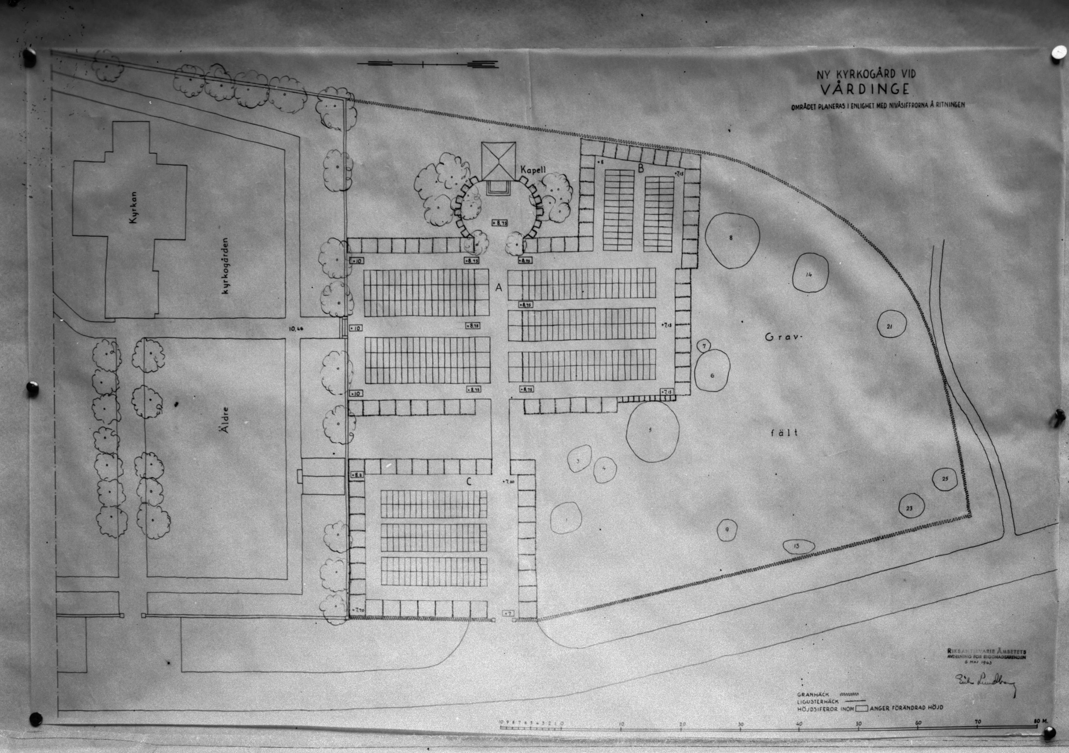 Beskrivning: Planritning, kyrkan och kyrkogården, angående planering av ny kyrkogård.