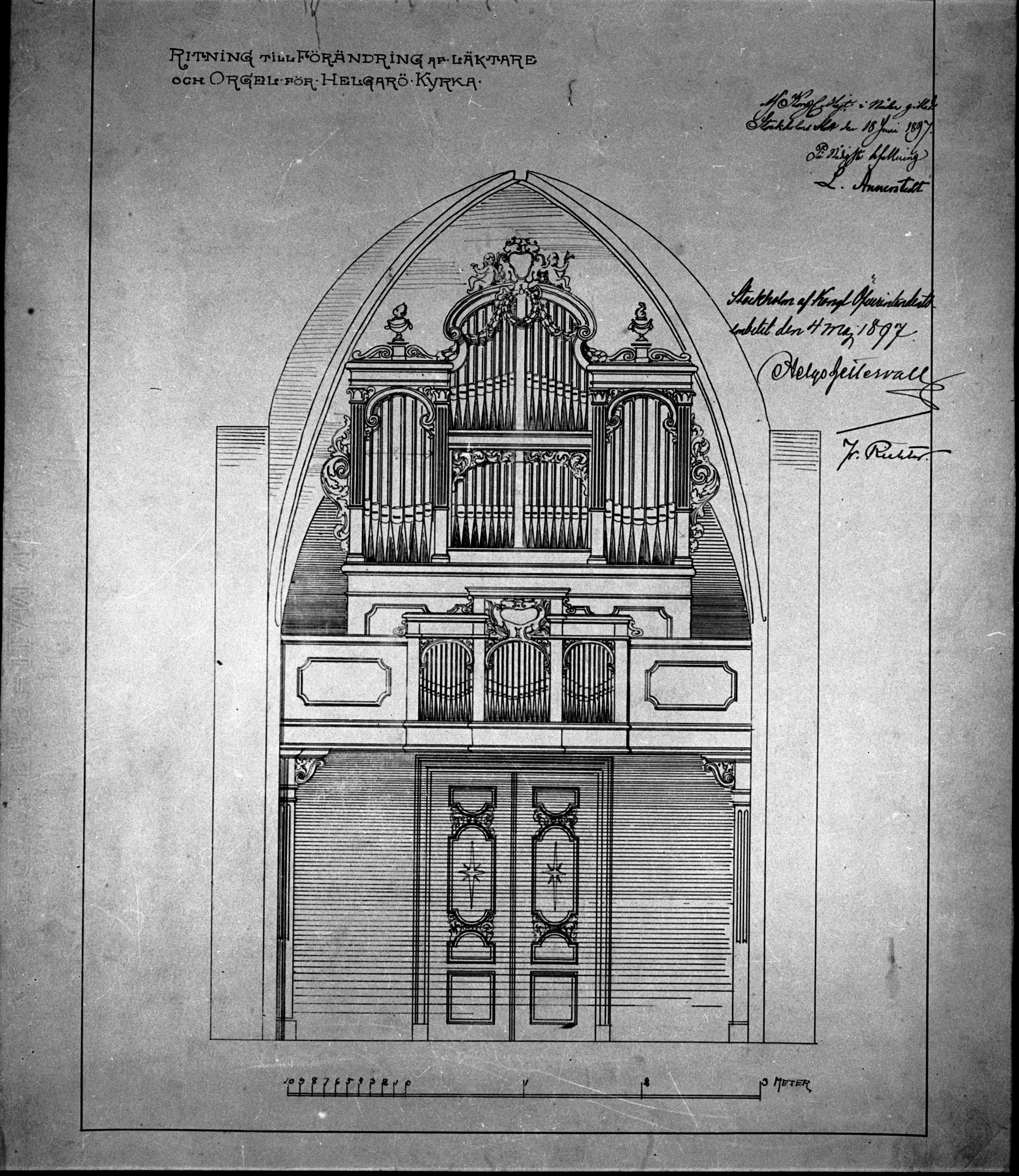 Beskrivning: Foto av ritning till förändring av läktare och orgel. I kyrkans arkiv.