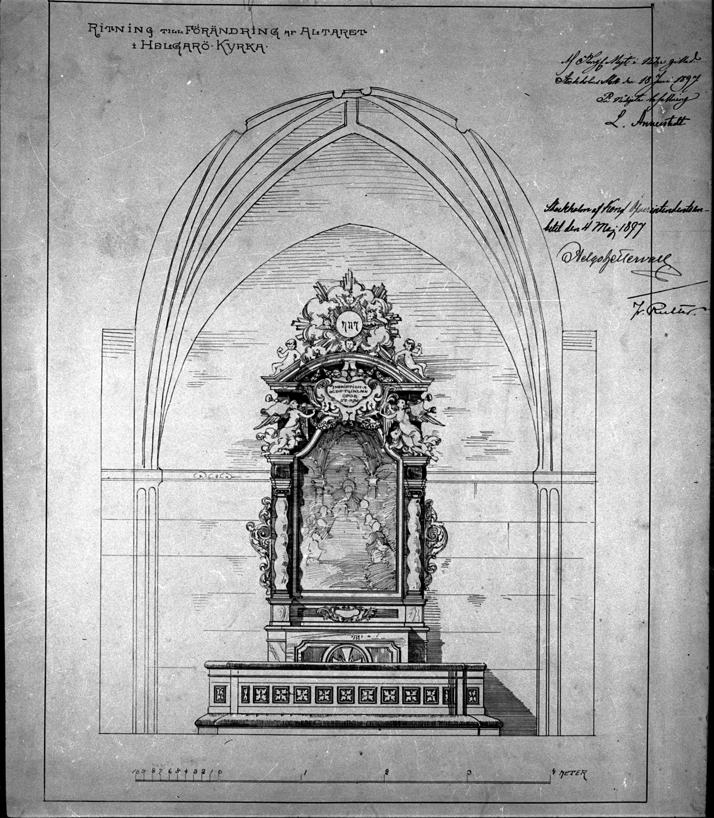 Beskrivning: Foto av ritning till förändring av altaret. I kyrkans arkiv.