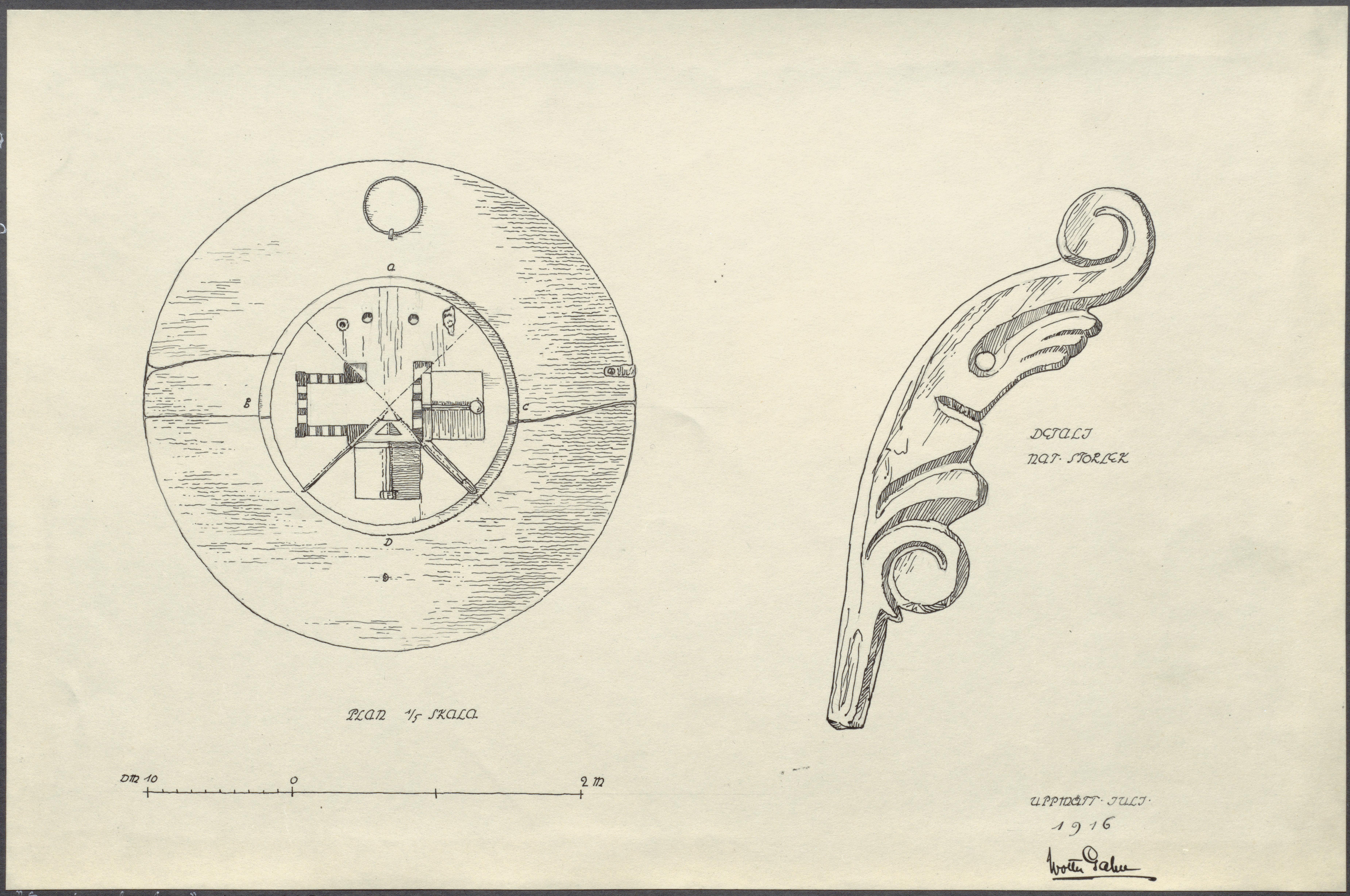 Beskrivning: Planritning av dopfuntslocket samt tuschteckning av ett stiliserat drakhuvud, tillhörande locket. Av Wolter Gahn, juli 1916.