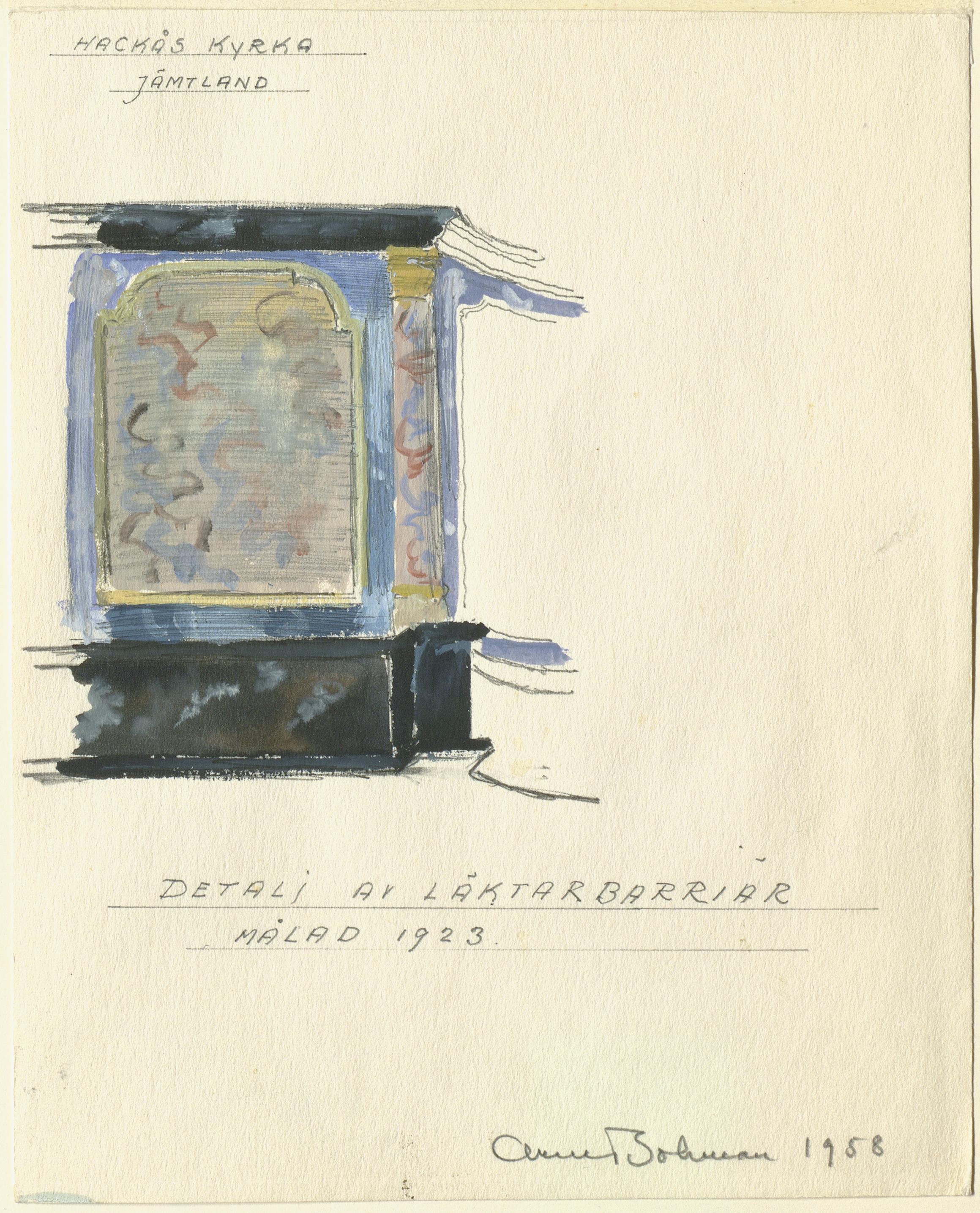 Beskrivning: Detalj av fält på orgelläktaren, bemålad 1923. Gouache av Arne Bohman 1958.