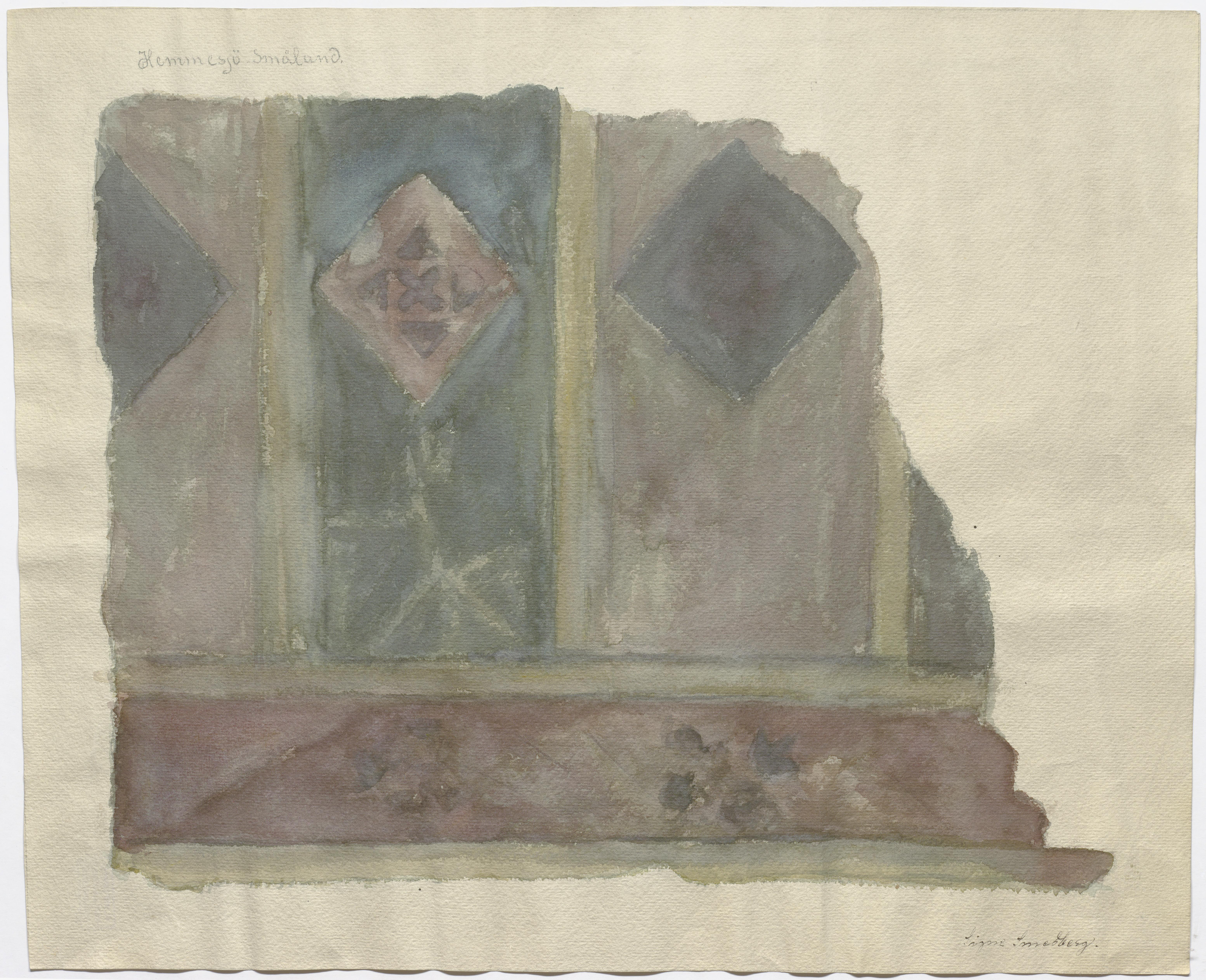 Beskrivning: Detalj av senmedeltida processionsfana, från gamla kyrkan, nu i Smålands museum, invnr 82. Akvarell av Signe Smedberg 1905.