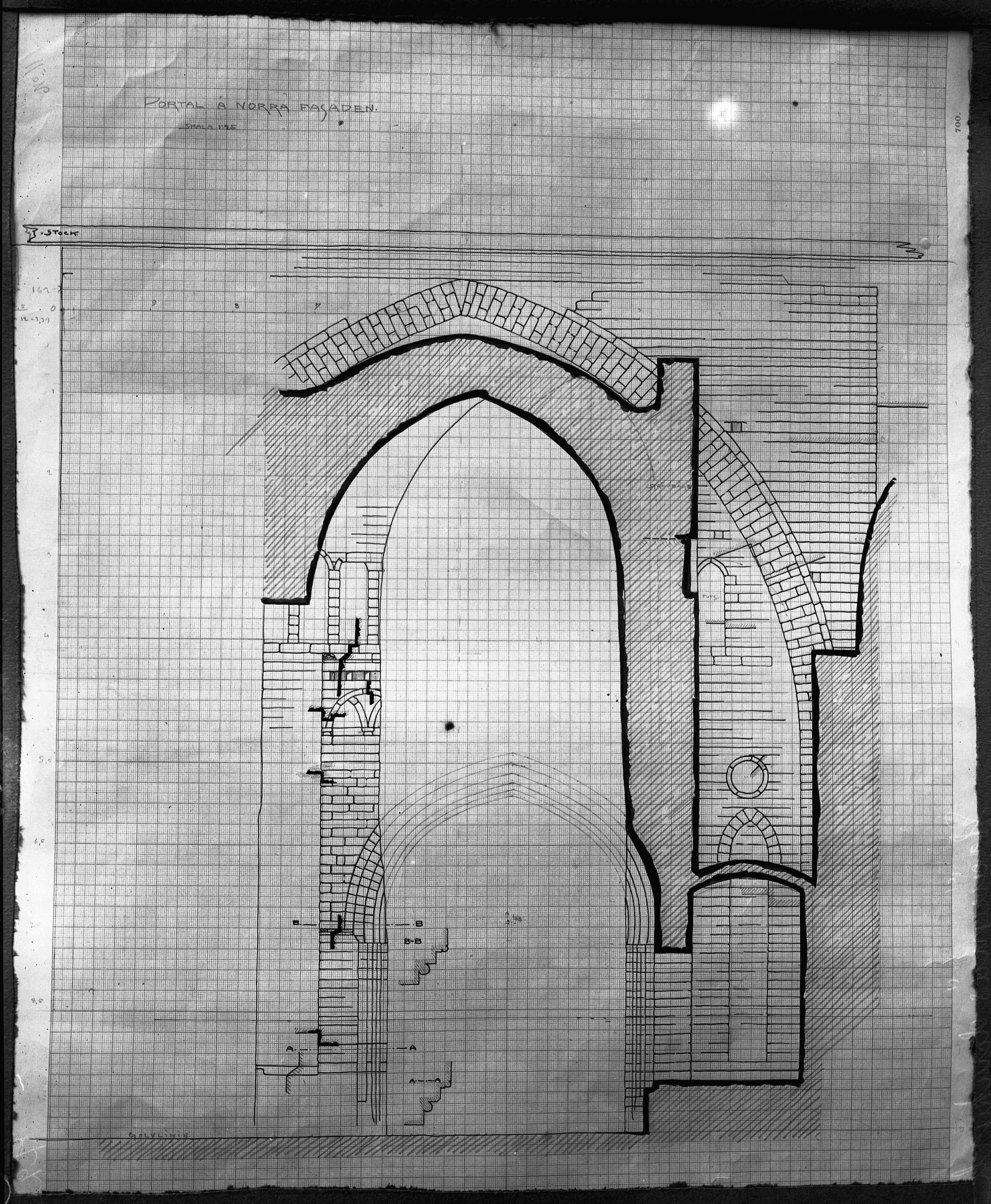 Beskrivning: Portal på norra fasaden, ritning, avfotograferad.