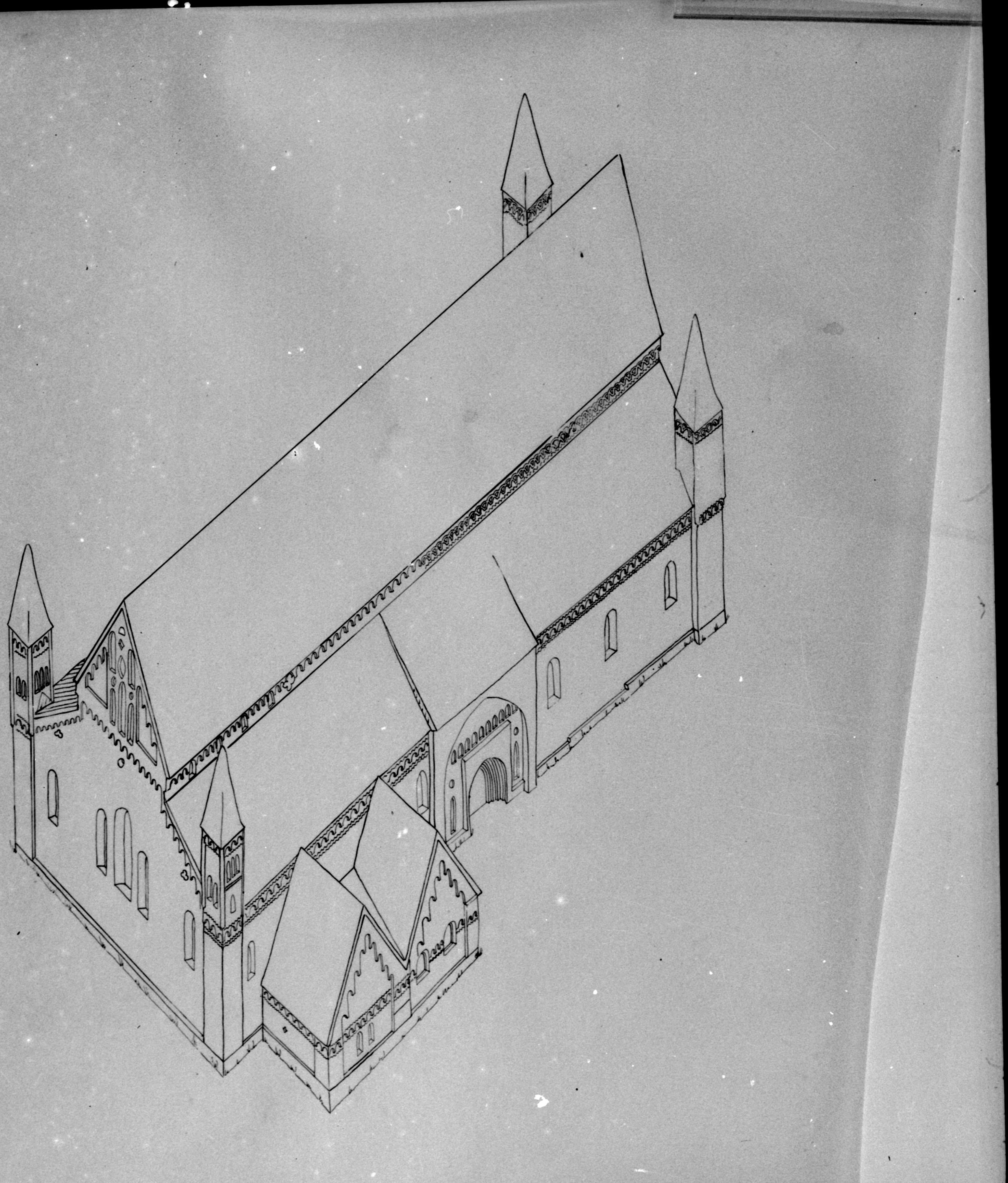 Beskrivning: Kyrkan, Kärnkyrkan sedd ovanifrån, mot sydöst, ritning, avfotograferad.