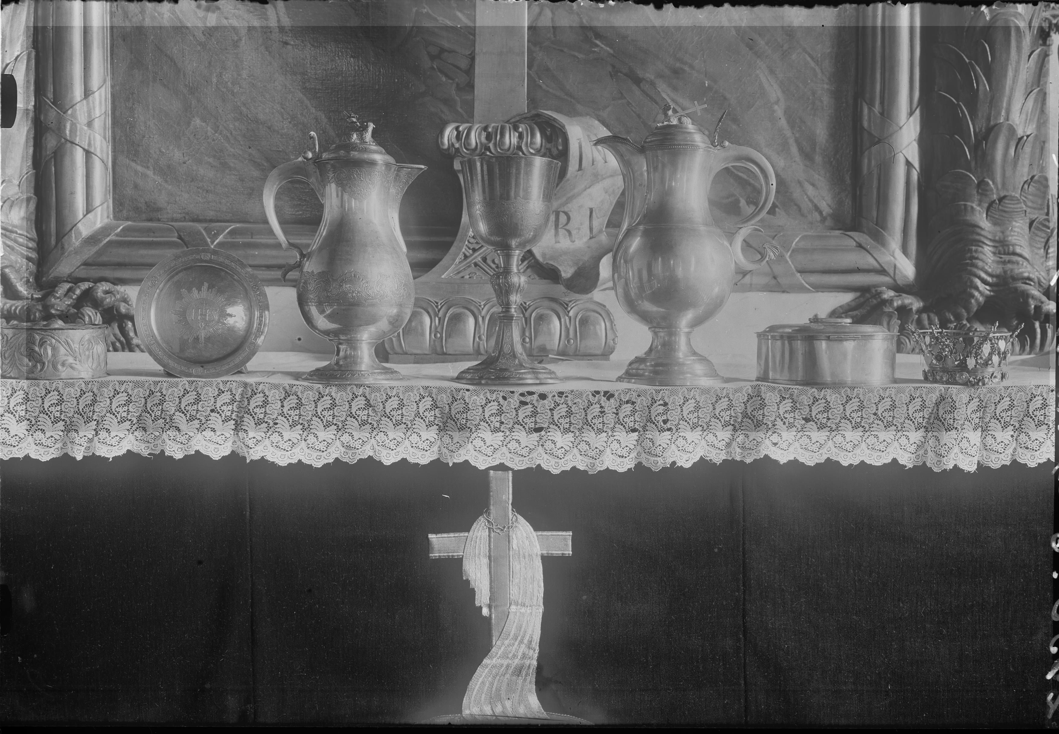 Beskrivning: Altare, uppställning av diverse gudstjänstutensilier: kalk, patén, oblataskar, kannor, brudkrona.