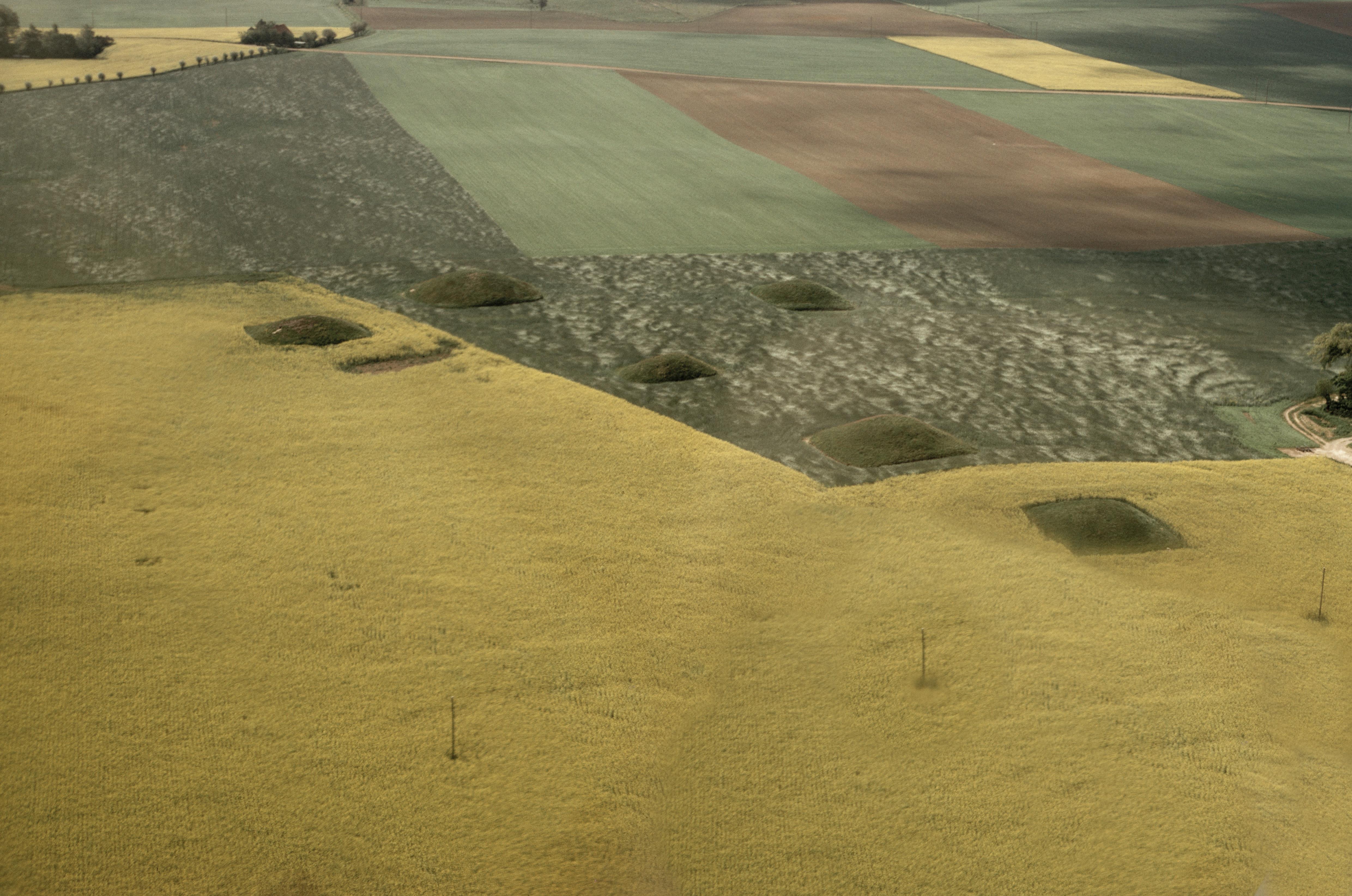 Beskrivning: Steglarps gravfält med flera bronsåldershögar: Sandhög RAÄnr Fuglie 9:1, Lillehög Fuglie 8:1, Storehög Fuglie 8:2, Grytehög Fuglie 11:1. Högarna Fuglie 6:1 och 7:1, i bildens nedre del. Bilden är tagen mot (väderstreck): SSV