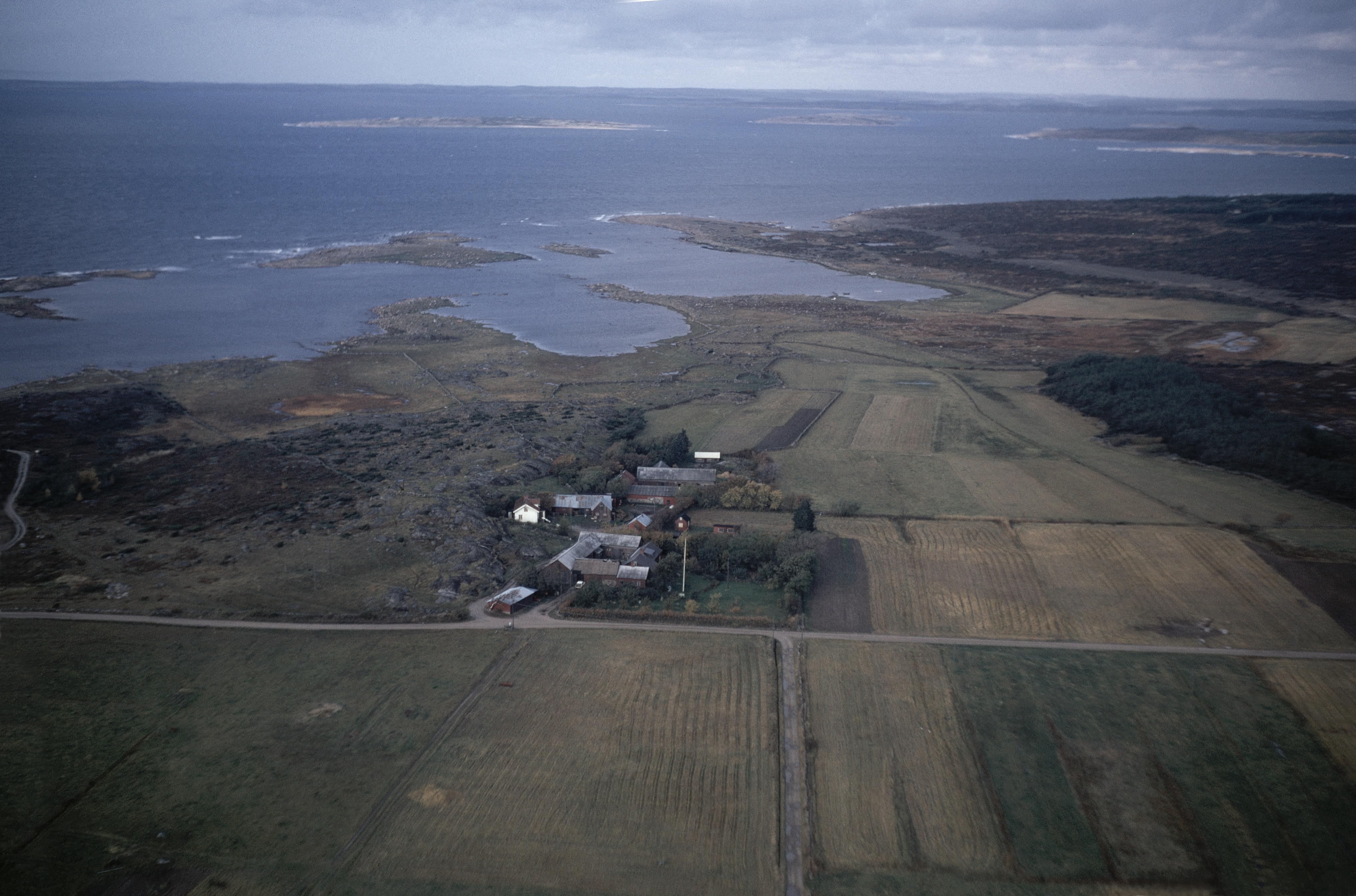 Beskrivning: Biskopshagens by vid Ringhals som den såg ut under den kulturhistoriska undersökningen i 1968, före utbyggnaden av Ringhals kraftverk. Byn togs bort under utbyggingen av kraftverket. Närmast byn fanns röse RAÄnr Värö 183:1. Bilden är tagen mot (väderstreck): NV