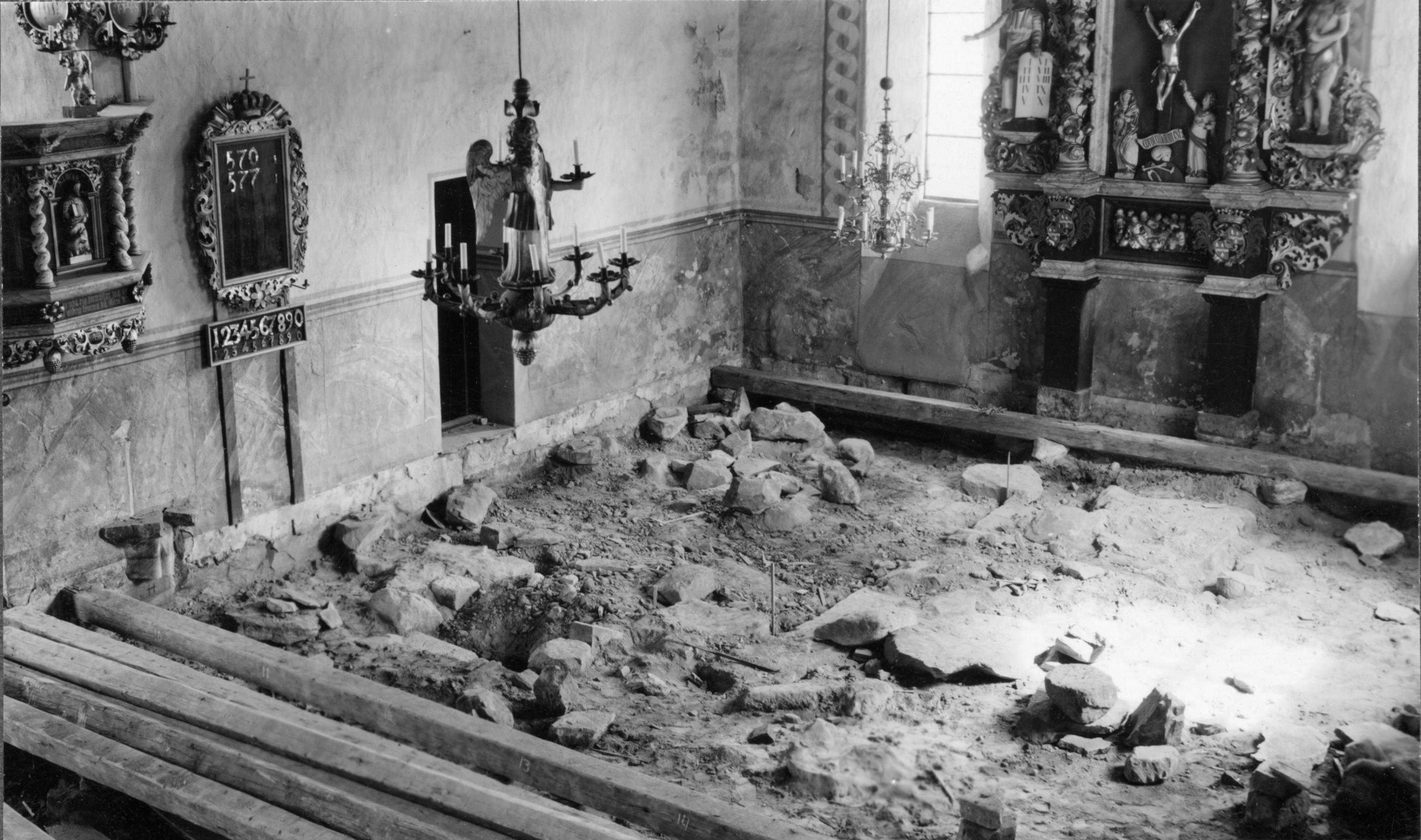 Beskrivning: Före undersökning i koret. Nordöstra sidan en murad grav. Rester av grund för altare.