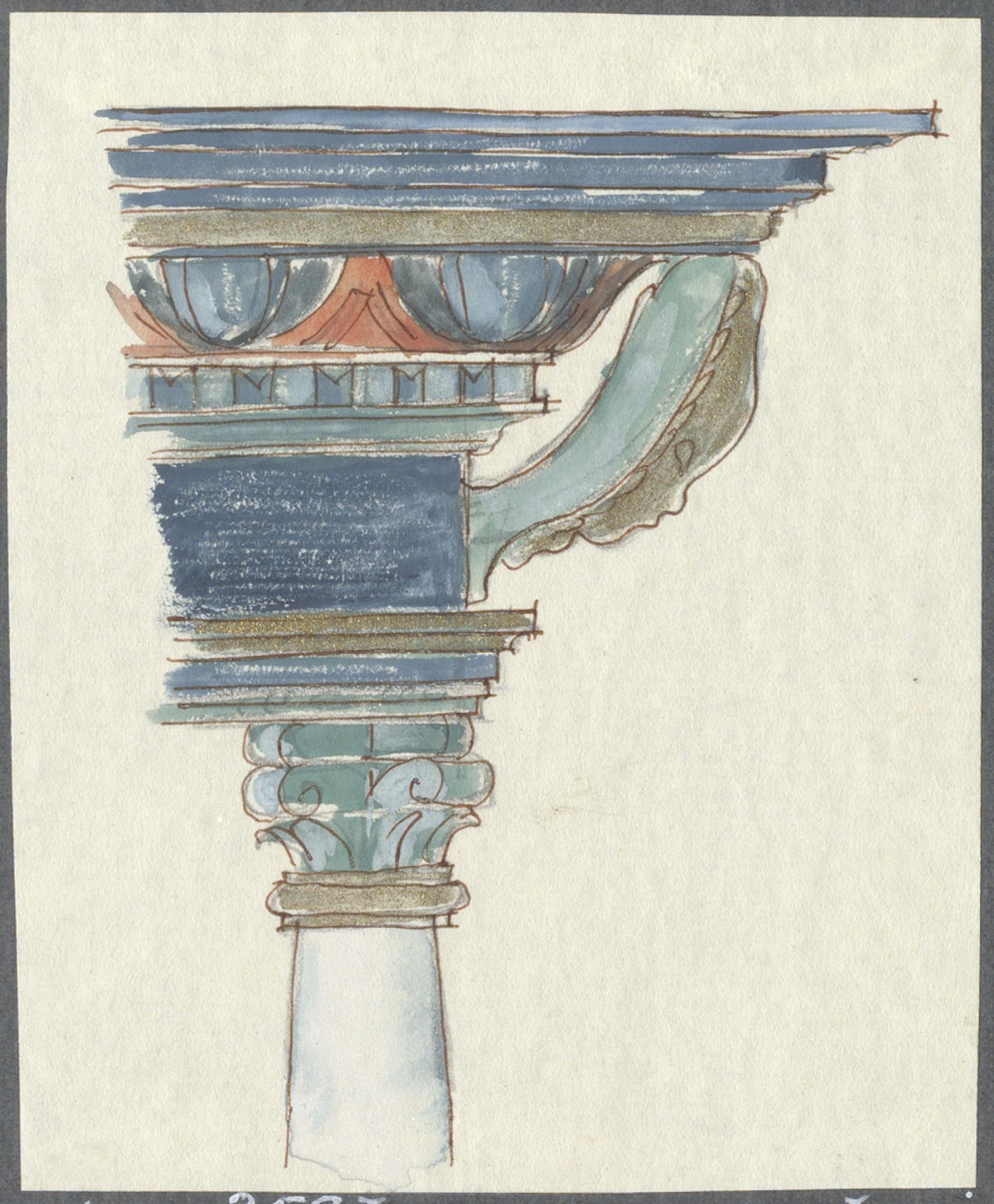 Beskrivning: Detalj av predikstolen från 1634, ursprungligen från Vika kyrka. Akvarell av Jerk Werkmäster, juni 1931.