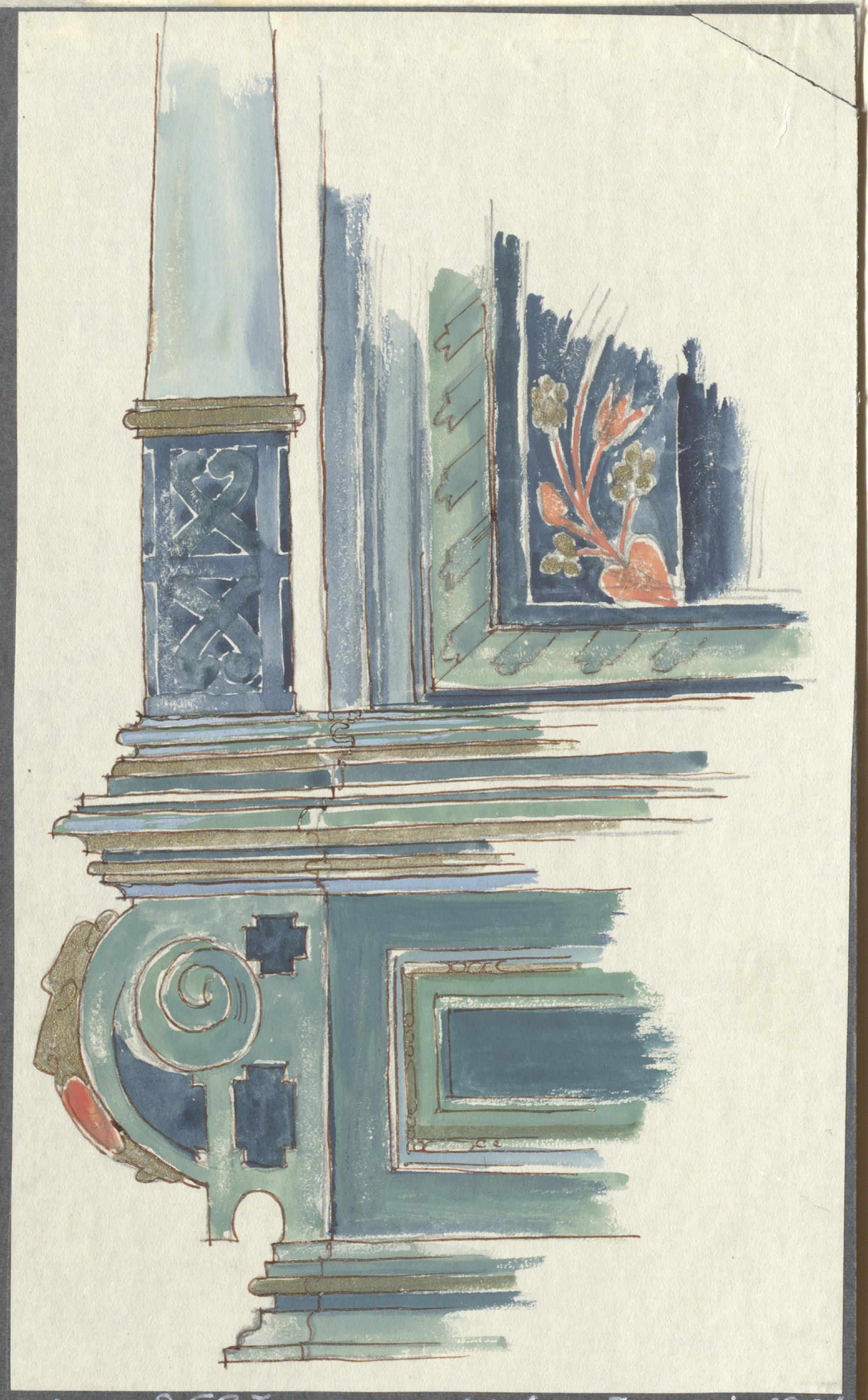 Beskrivning: Detalj av predikstolen från 1634, ursprungligen från Vika kyrka. Akvarell av Jerk Werkmäster, juni 1931.
