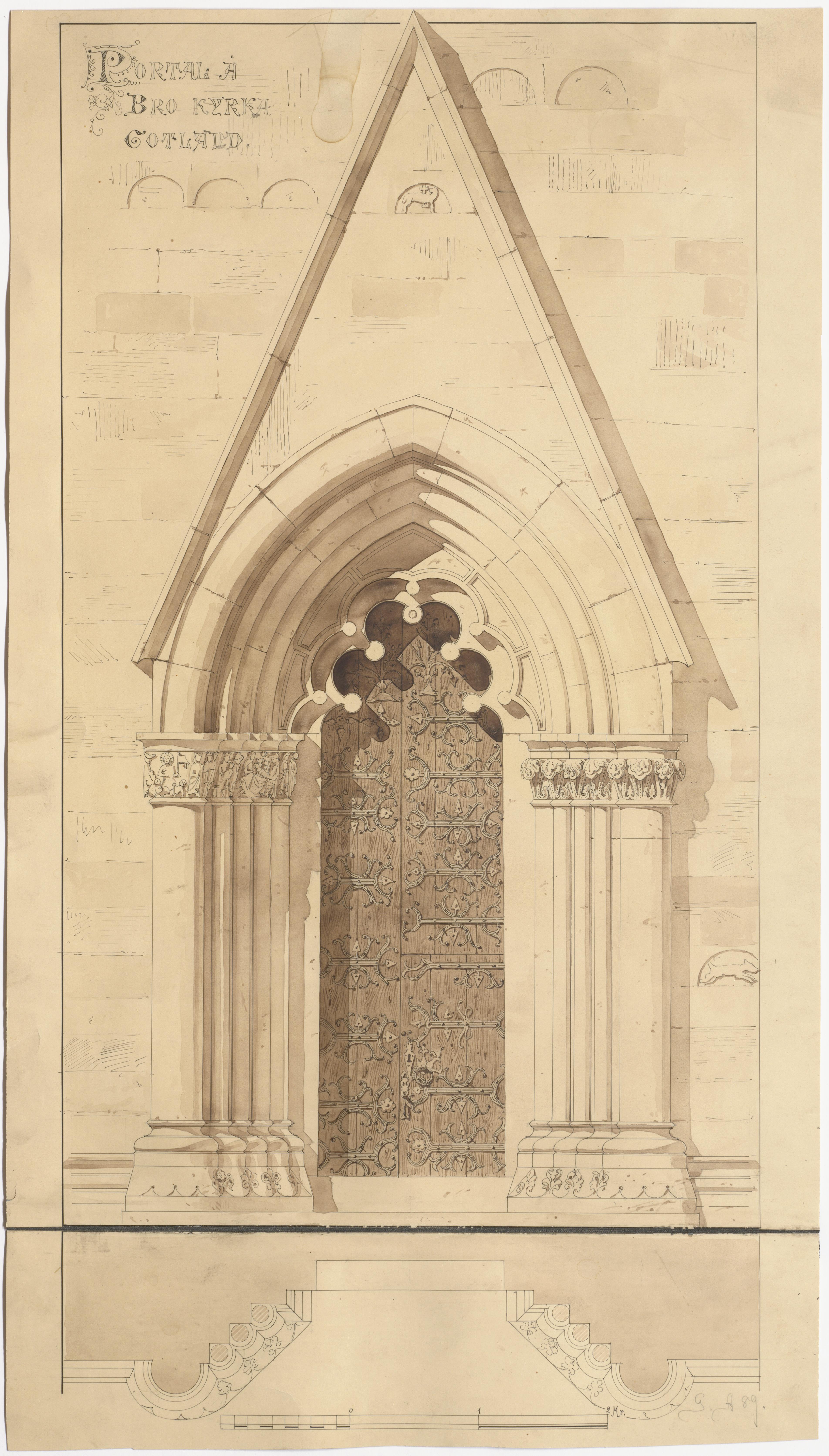 Beskrivning: Kyrkans sydportal. Akvarell av Gustaf Améen, 1889.