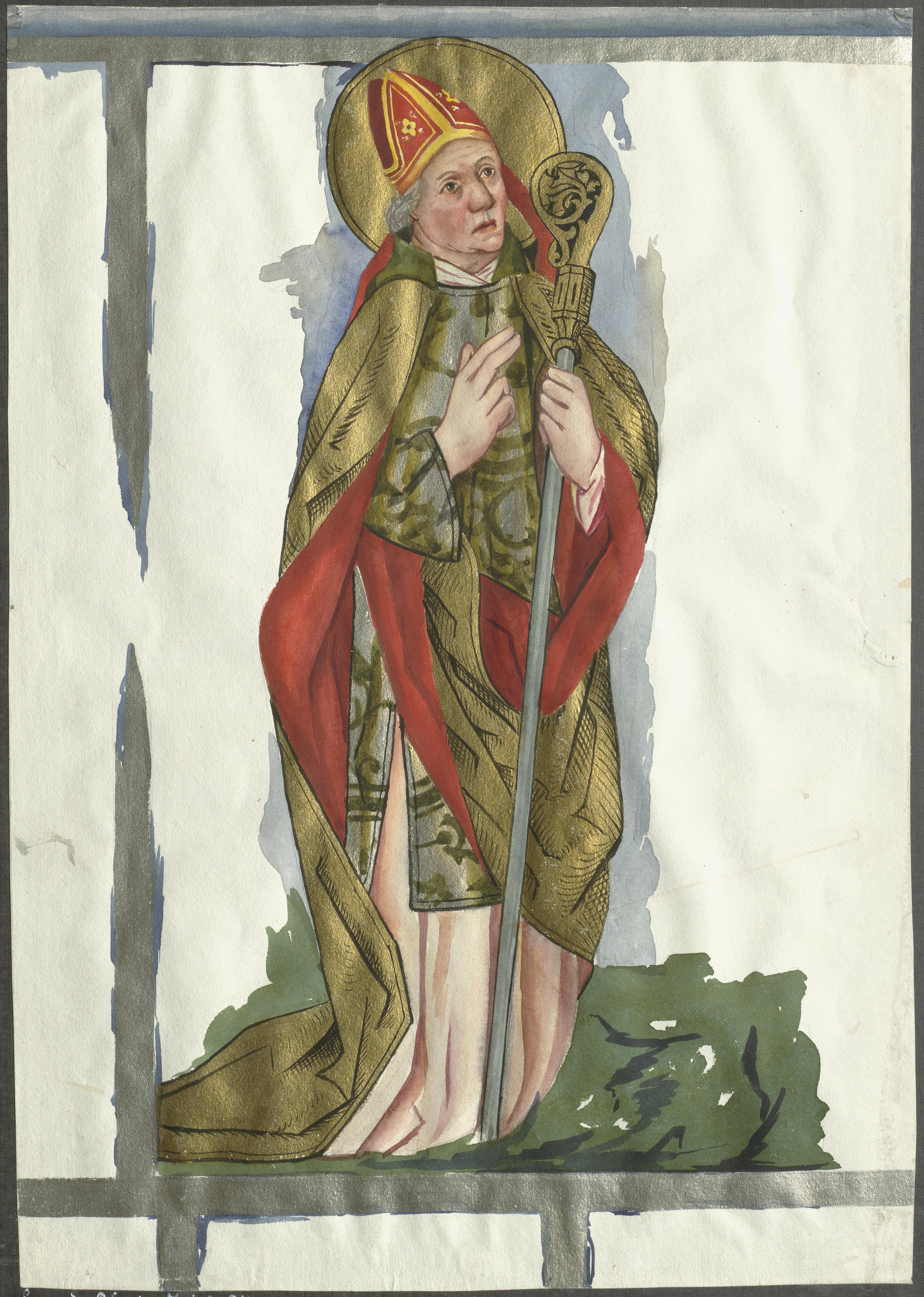 Beskrivning: Okänd helig biskop. Den ena sidan av en processionsfana från senmedeltiden, nu i Domkyrkomuseet, inv.nr 3182:2. Akvarell.