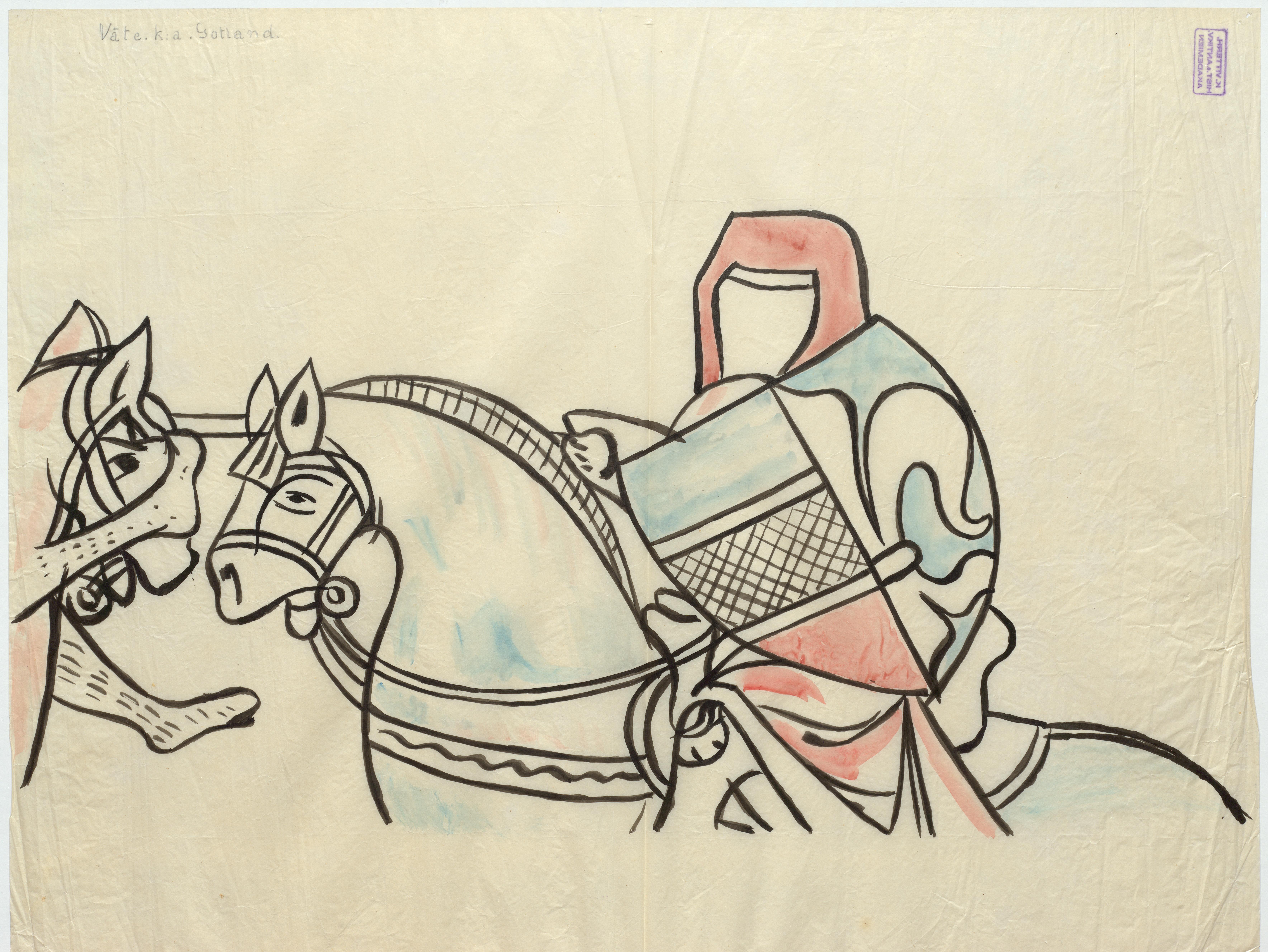 Beskrivning: Tornérscen - fragmentarisk. Bemålad träpanel, eventuellt en del av ett korskrank. Nu i SHM. Akvarell, troligen från kalkering.