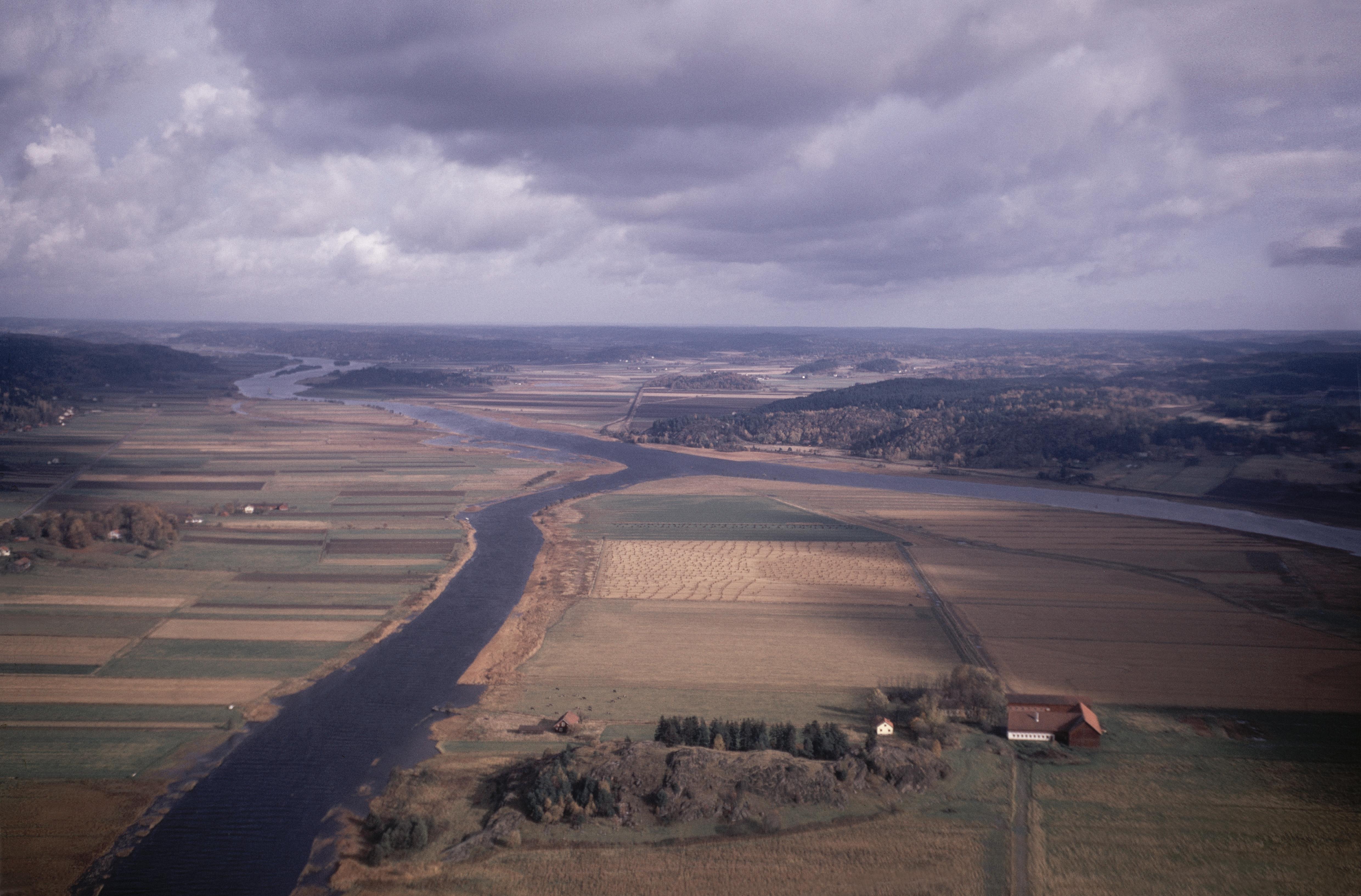 Beskrivning: Göta älv markerar gränsen mellan socknen Starrkärr (till vänster) och Romelanda. Kungsleden på ön Tjurholmen (i Romelanda socken) i bildens högra del. Bilden är tagen mot (väderstreck): SV