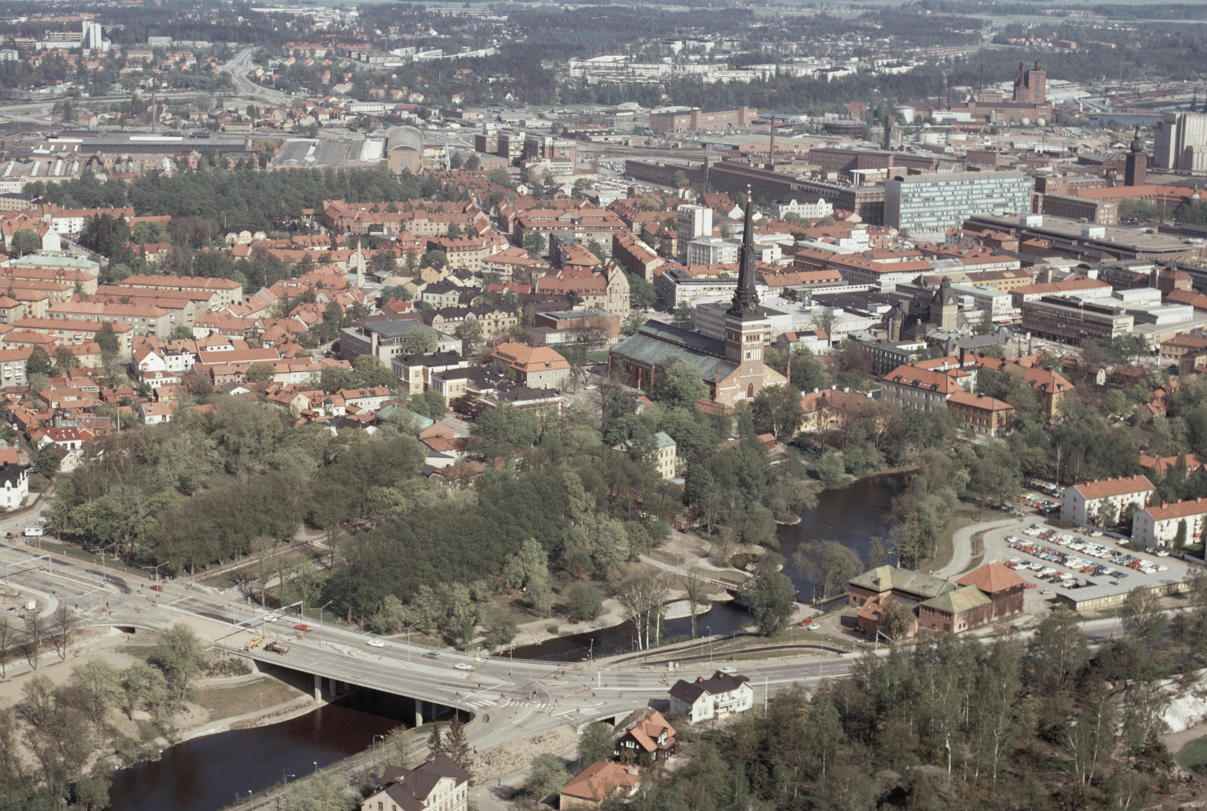Beskrivning: Västerås stad vid Svartån och Västeråsfjärden i Mälaren. Vid bildens mitt Västerås domkyrka i stadslager RAÄnr Västerås 232:1. Bilden är tagen mot (väderstreck): OSO