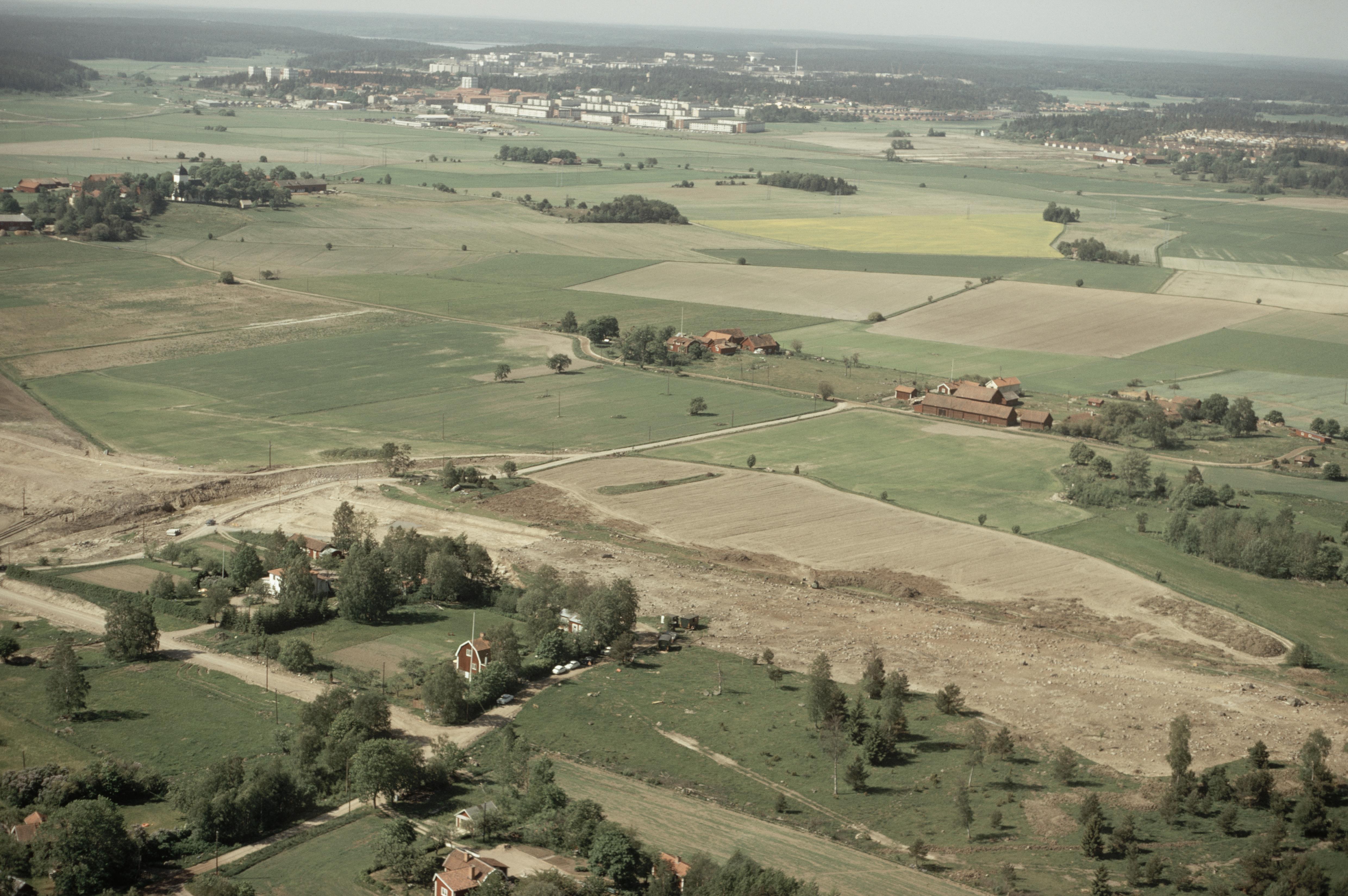 Beskrivning: Arkeologisk undersökning av gravfält RAÄnr Husby-Ärlinghundra 205 innan vägbygge. I bildens övre del Husby-Ärlinghundra kyrka mot Märsta tätort. Bilden är tagen mot (väderstreck): SV