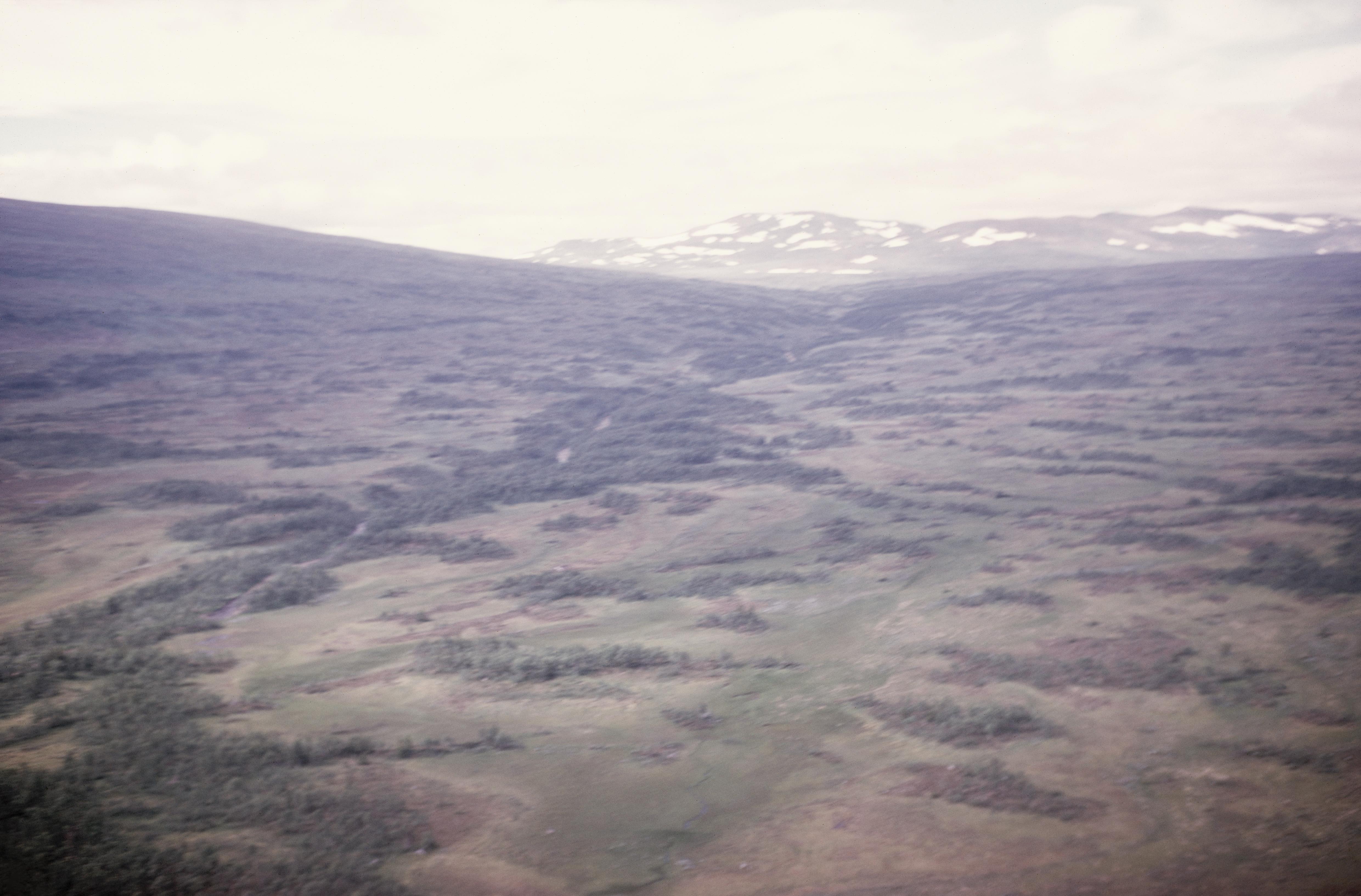 Beskrivning: Dalgången mellan sjön Raaevrejaevrie (Raukajaure) och samvistet Skårnja, söder om fjällområdet Skårnja (i bildens övre del). Fjället Raavre (Raure) uppe till vänster. Bilden är tagen mot (väderstreck): NO