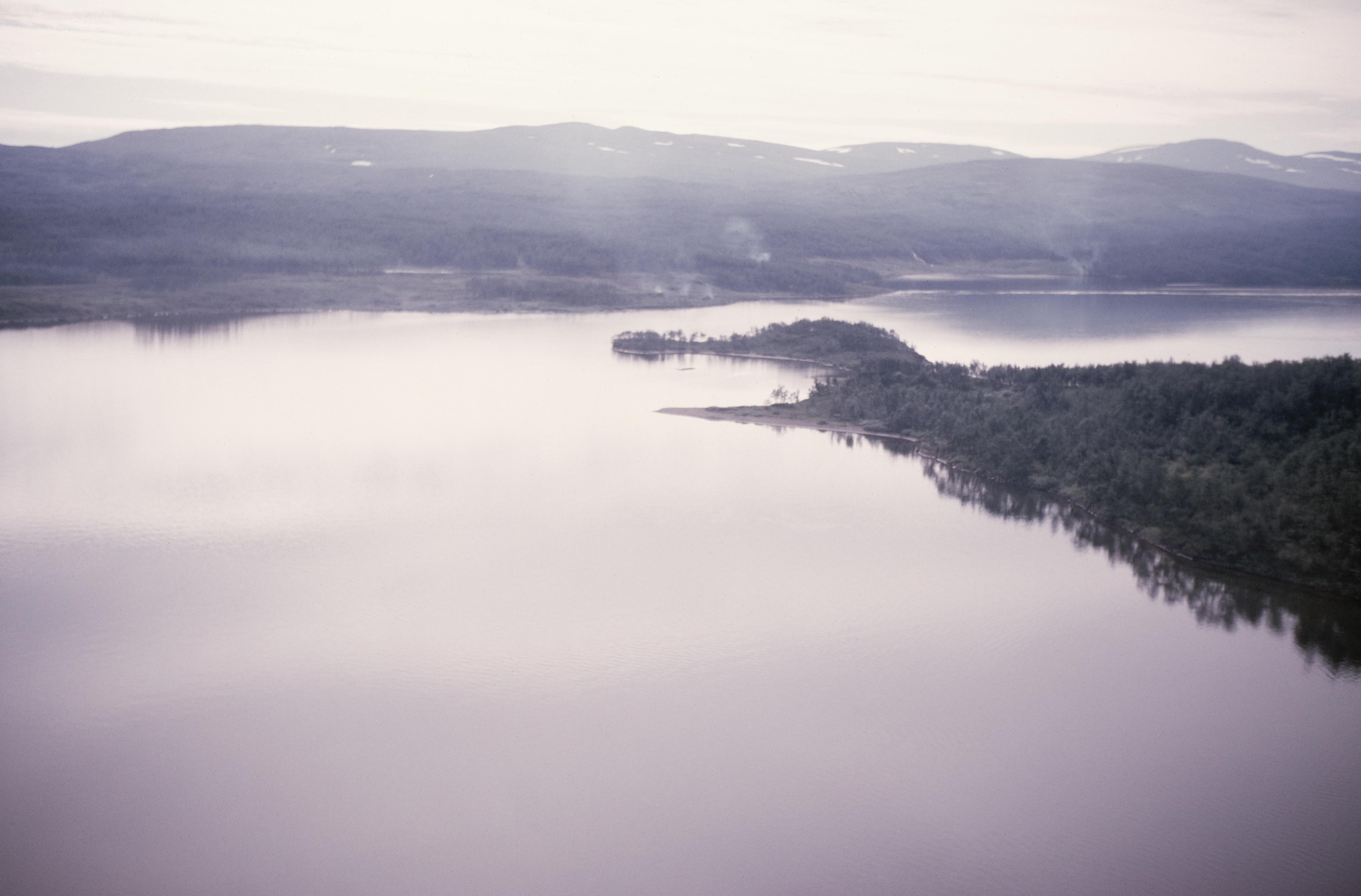Beskrivning: Abelvattnets östra del (Luvlie Aapije) innan sjöregleringen / uppdämningen. Dämningsröjning med vegetationsbränder pågår. Till höger udden Tjuvvelge vid Mittisundet (RAÄnr Tärna 125:1). Till höger över bildens mitt skymtar Abelvattnets västra del (Jillie Aapije). Bilden är tagen mot (väderstreck): S