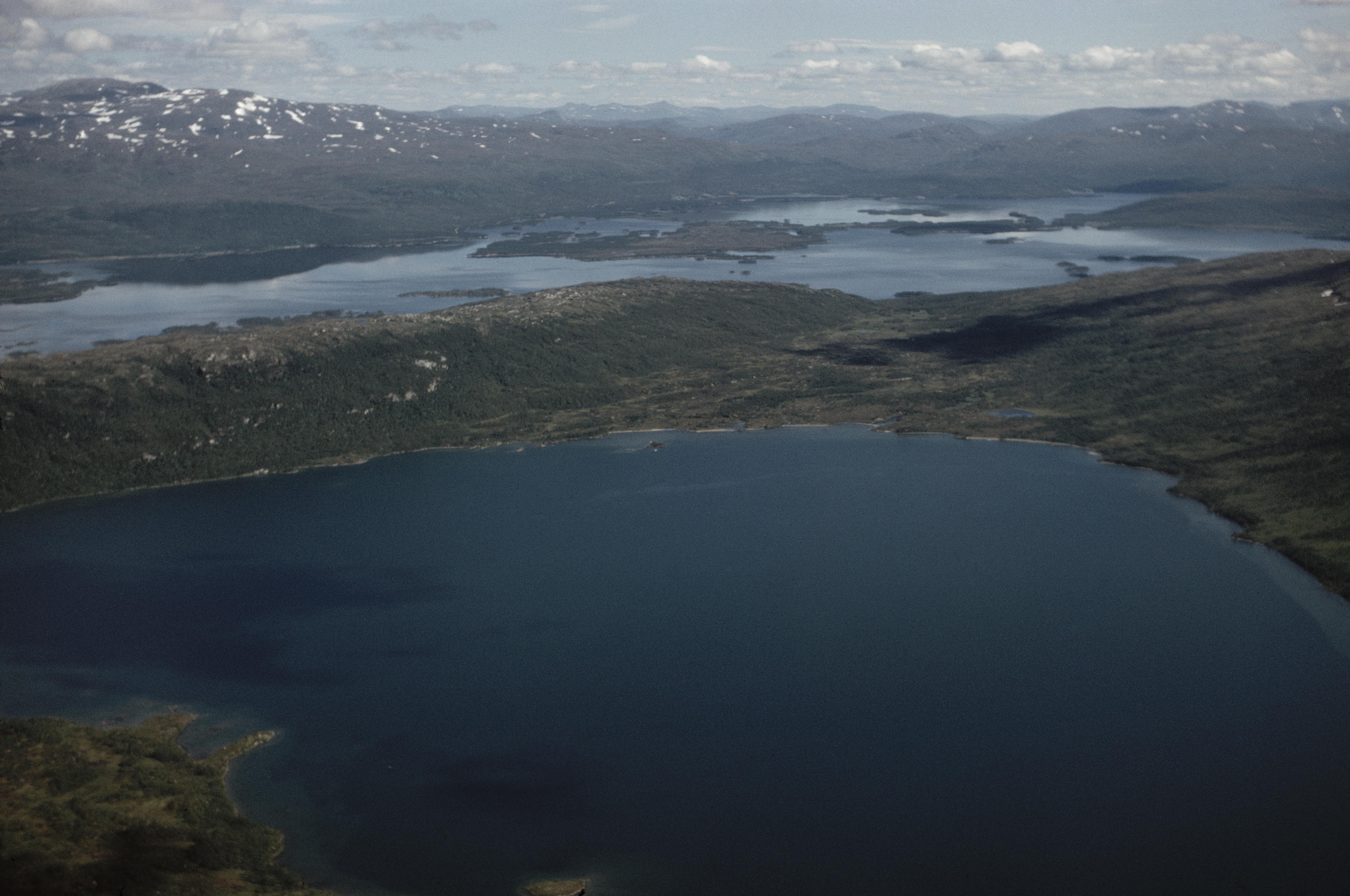 Beskrivning: Längs bildens nedre kant går gränsen mellan Sverige - Norge (udden nere till vänster är i Norge). Boplats RAÄnr Tärna 77:1 m.m. vid stranden till höger över bildens mitt. Över bildens mitt Fjällripfjället (Stråmhpoe) mot sjöarna Över-Uman (Jillemes Upmeje) och Gaske Upmeje. Bilden är tagen mot (väderstreck): Ö