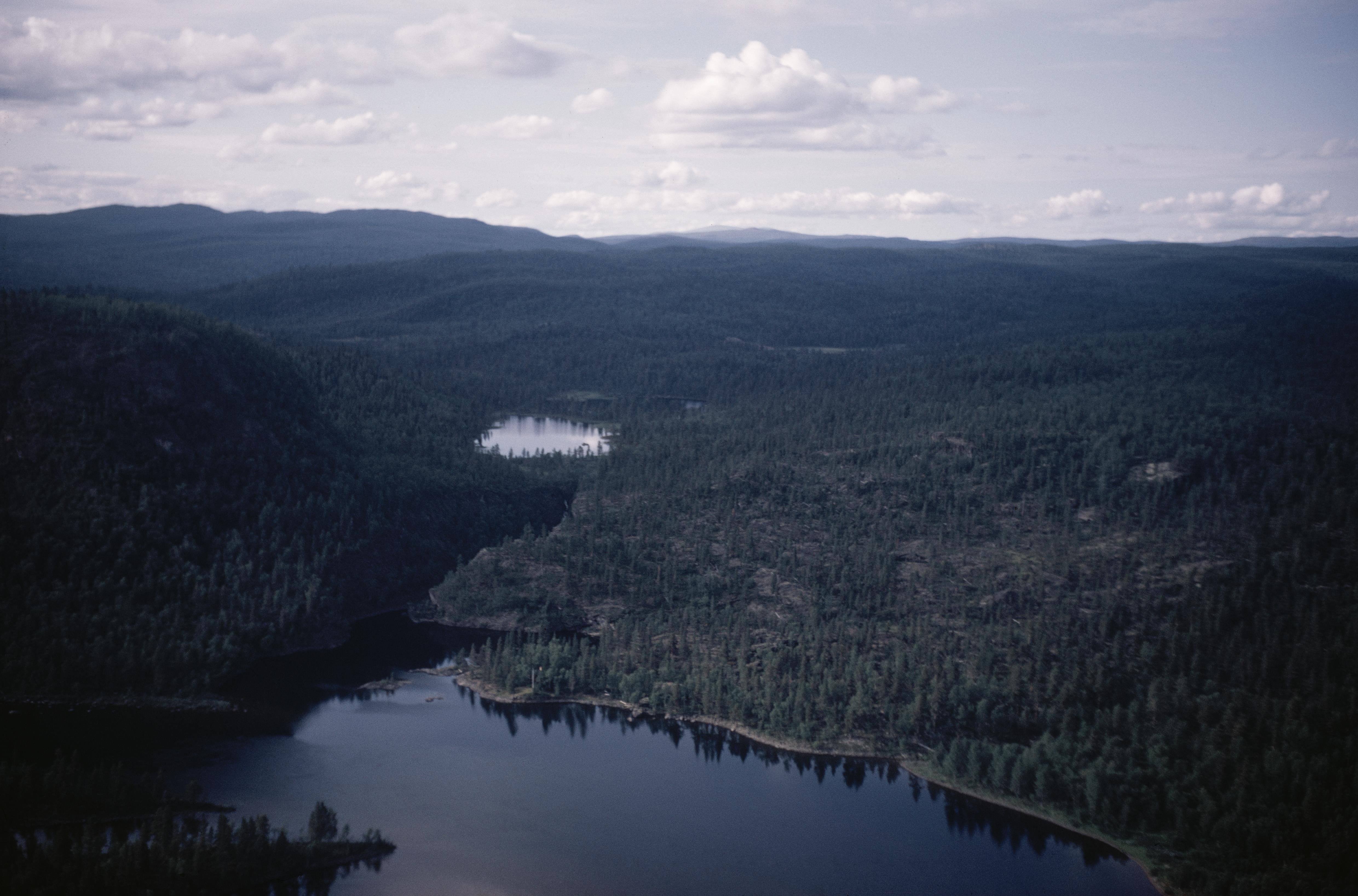 Beskrivning: Till vänster längs bildens mitt Laisälvens (Lájsso) gamla utlopp i östra ändan av Gautosjön (Gávttojávrre / Gautojaure). Märkberget i bildens i vänstra kant. I bildens nedre del nya utloppet via Sikselet. Bilden är tagen mot (väderstreck): NV