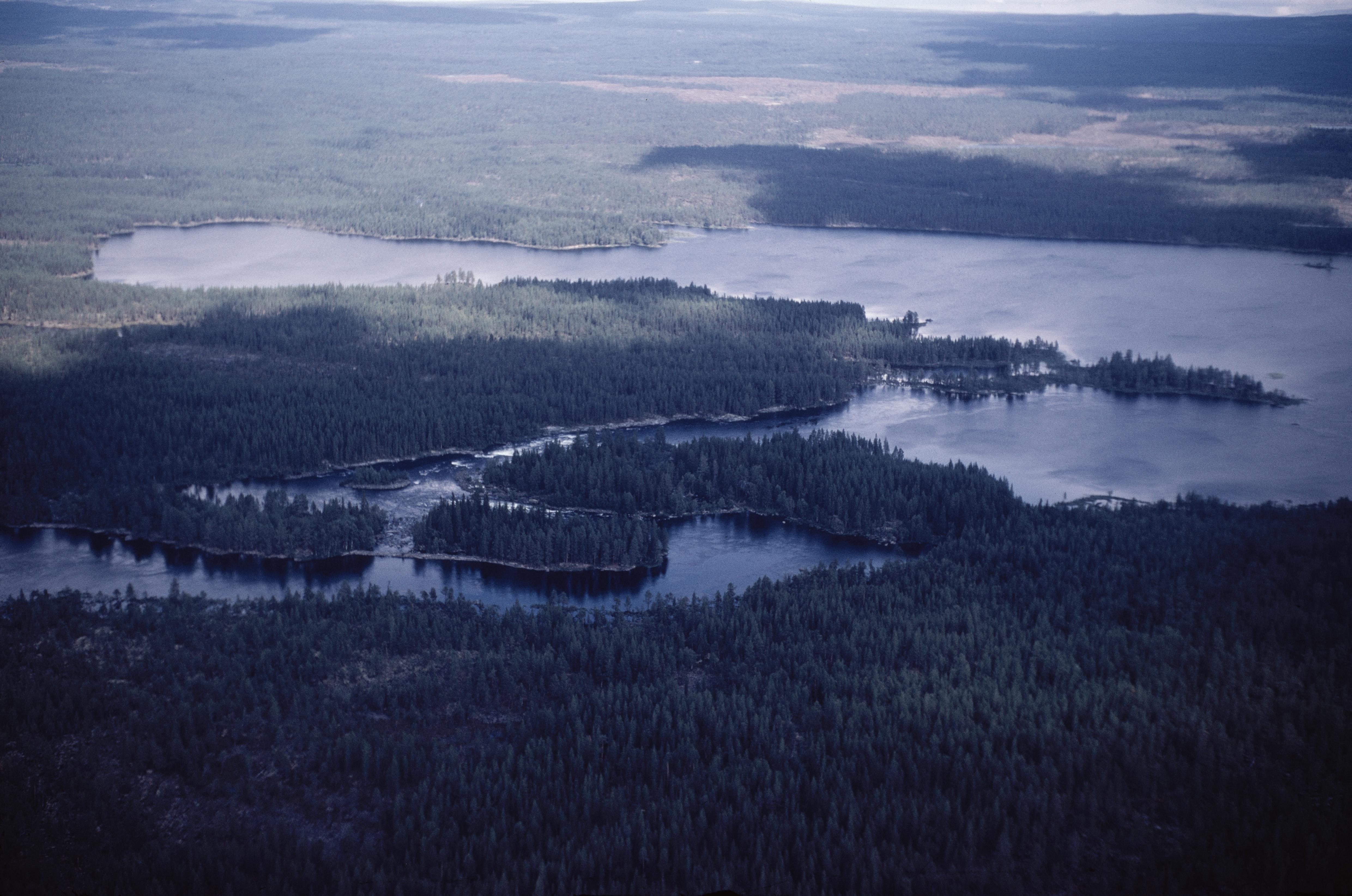 Beskrivning: Sundet Ljunghålet i sjön Grucken, mellan Över-Grucken (nere till vänster) och Ytter-Grucken. Vid stranden över bildens mitt boplats RAÄnr Storsjö 23:1. Storberget i bildens nedre del. Uppe till höger gränsen mot socknet Åsarne och landskapet Jämtland. Bilden är tagen mot (väderstreck): NNO