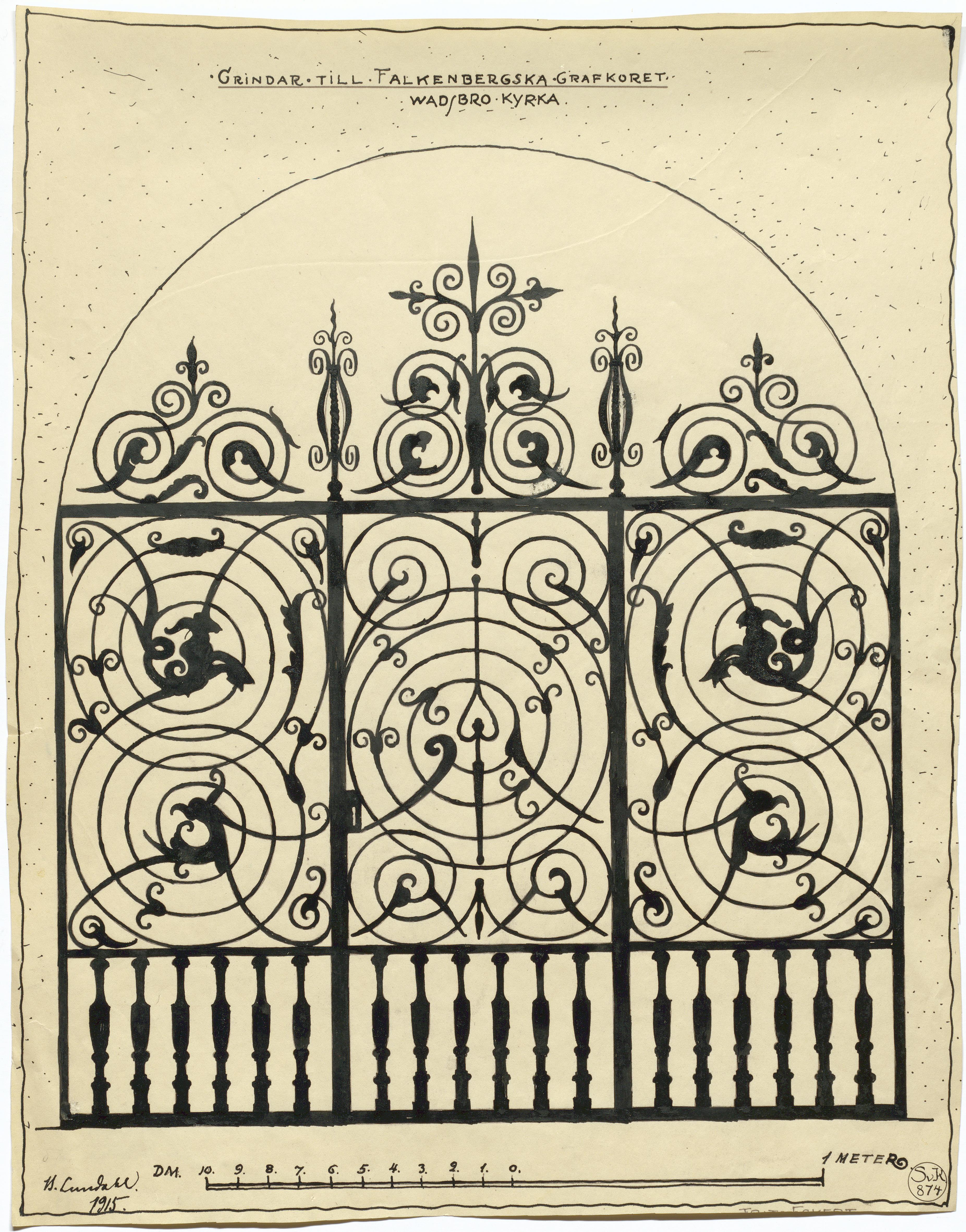 Beskrivning: Grindar till Falkenbergska gravkoret. Ritning av arkitekt Berndt Lundahl 1915 för Sveriges kyrkor.
