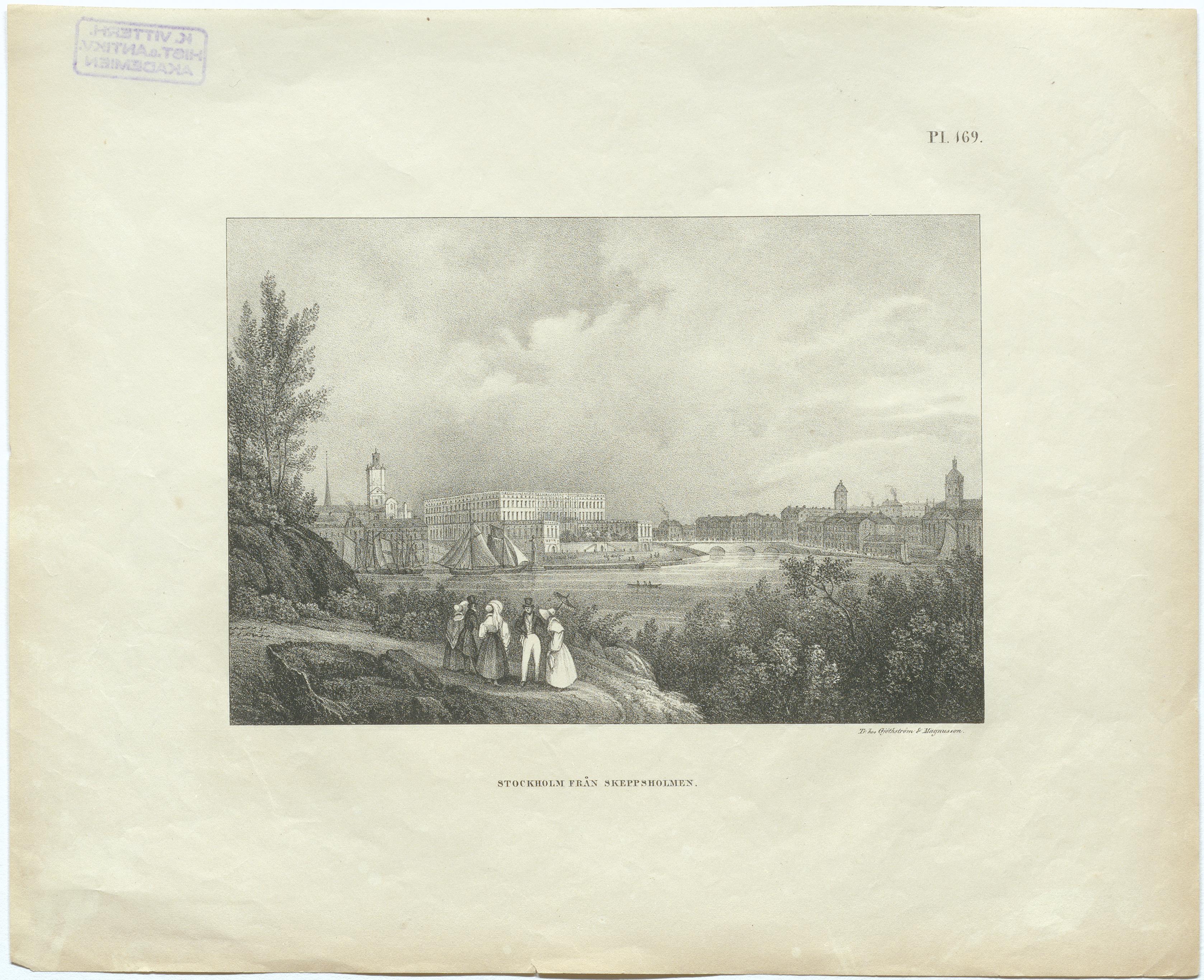 Beskrivning: Vy från Skeppsholmen. Litografi troligen från ca 1830, tryckt hos Gjöthström & Magnusson.