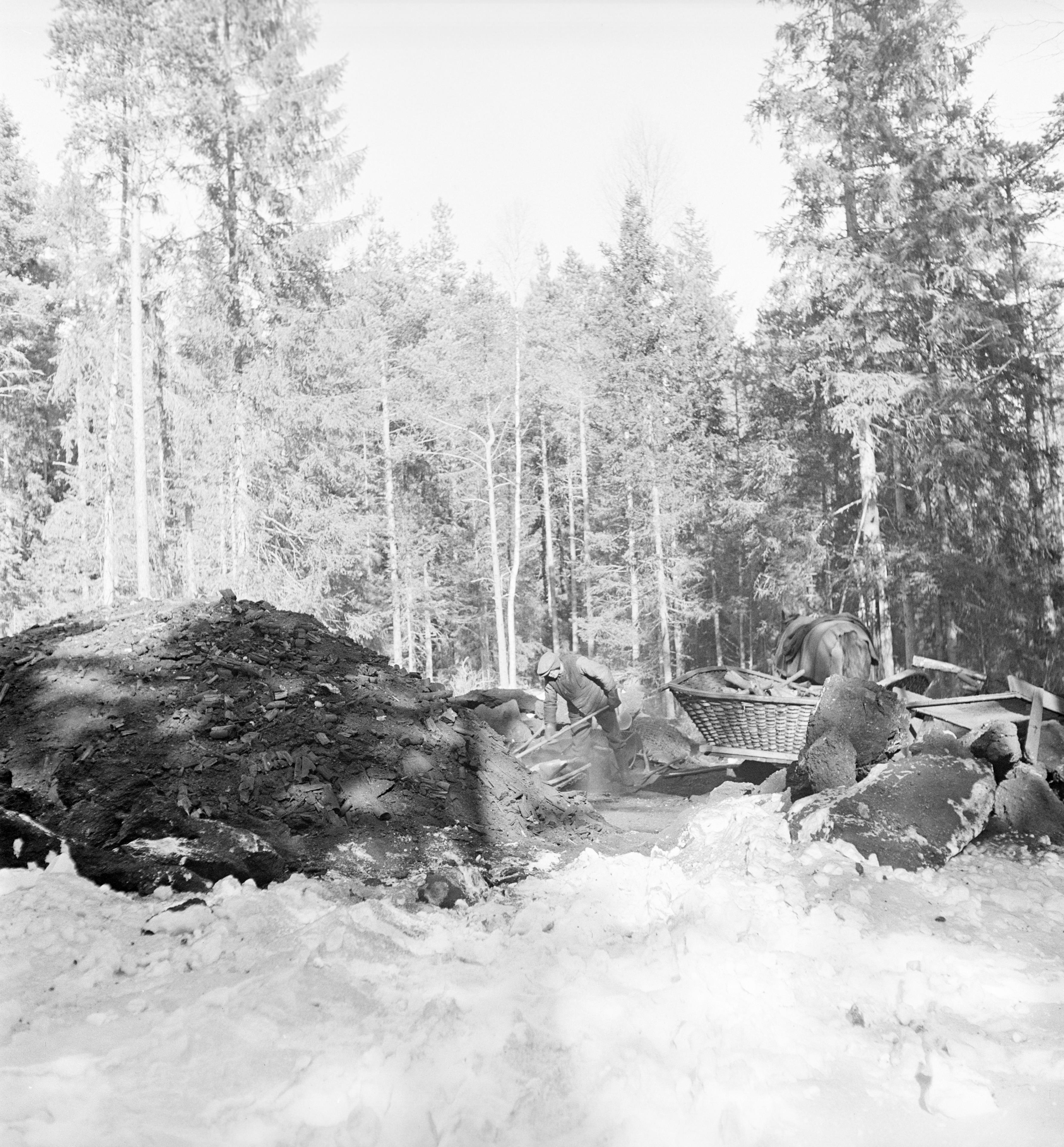 Beskrivning: Anmärkning (övrig): Noraskog i Västmanland? (Se Rosenbergs bilder från Järnboås.) Moraskog i Södermanland? (Se FMIS Fornsök - RAÄ-nummer Dunker 618.) Beskrivning: Arbete med kolmila. Fotosyfte: