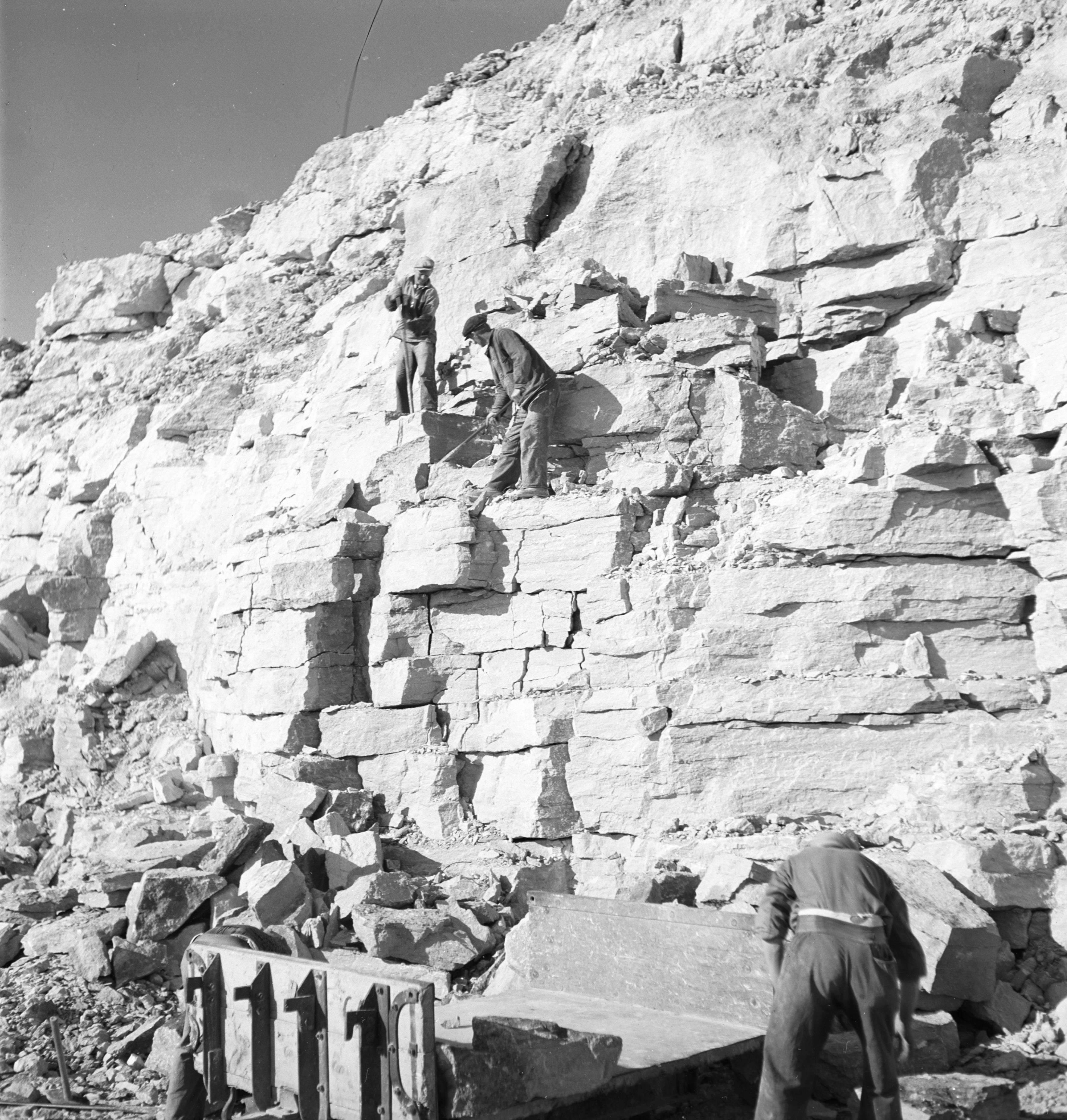 Beskrivning: Kalkbrytning. Bilden troligen från omkring 1940.