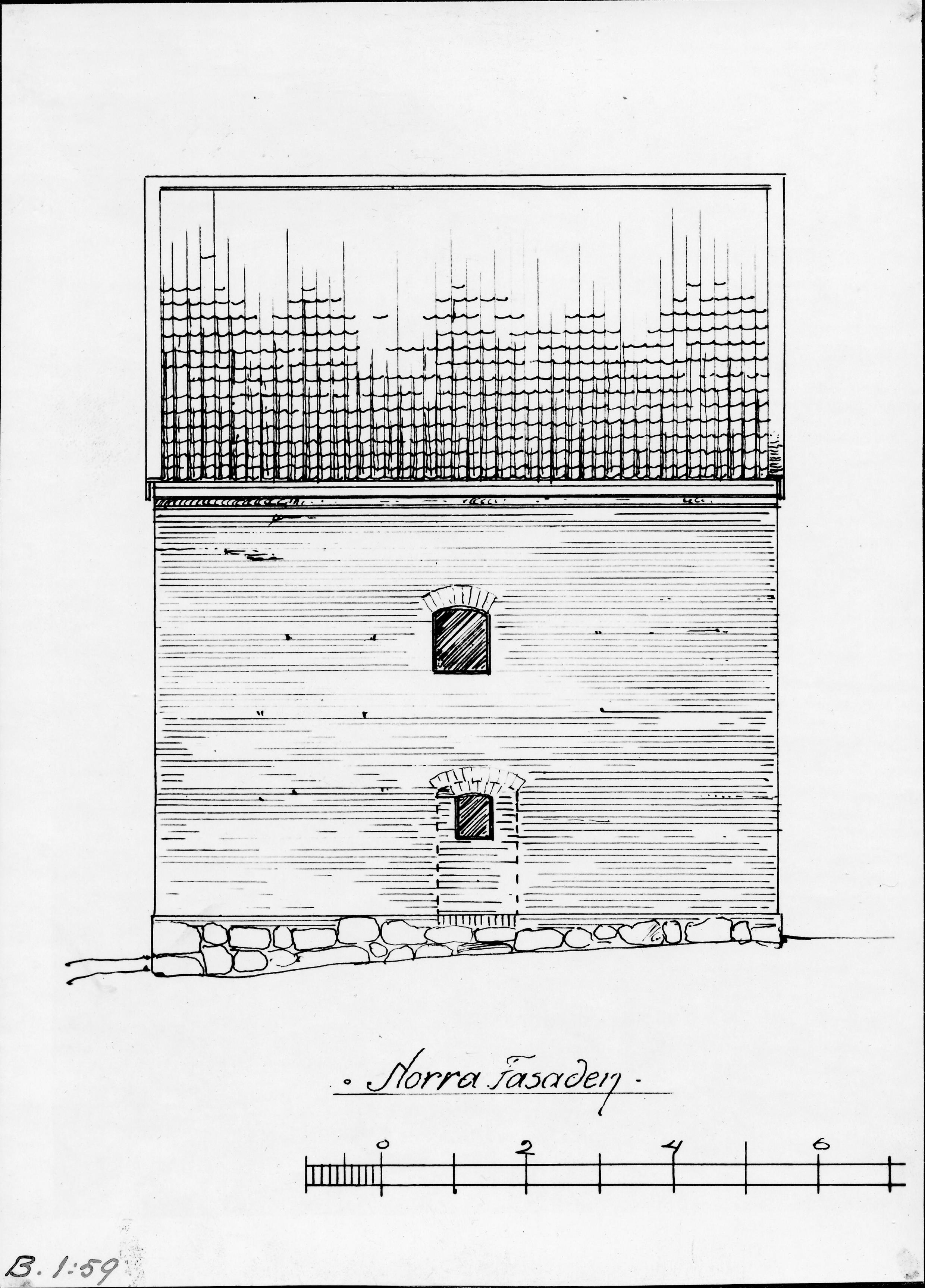 Beskrivning: Medeltida stenhuset (tiondeboden), norra fasaden. Uppmätning av Sigurd Curman. Avfotograferad.