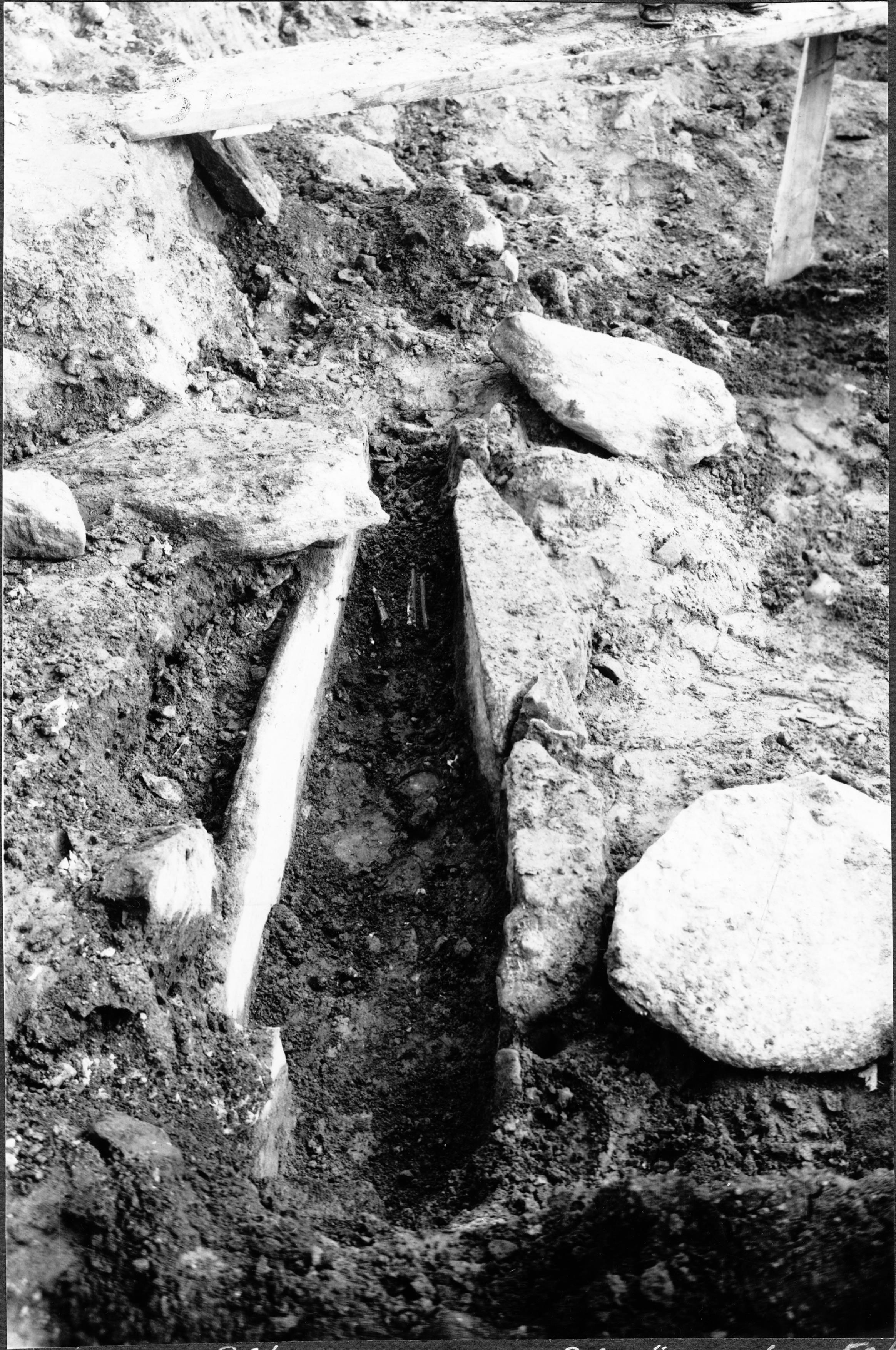 Beskrivning: Grav, utanför södra långhusväggen. Utgrävning för nytt pannrum. Grav funnen under utgrävningen.