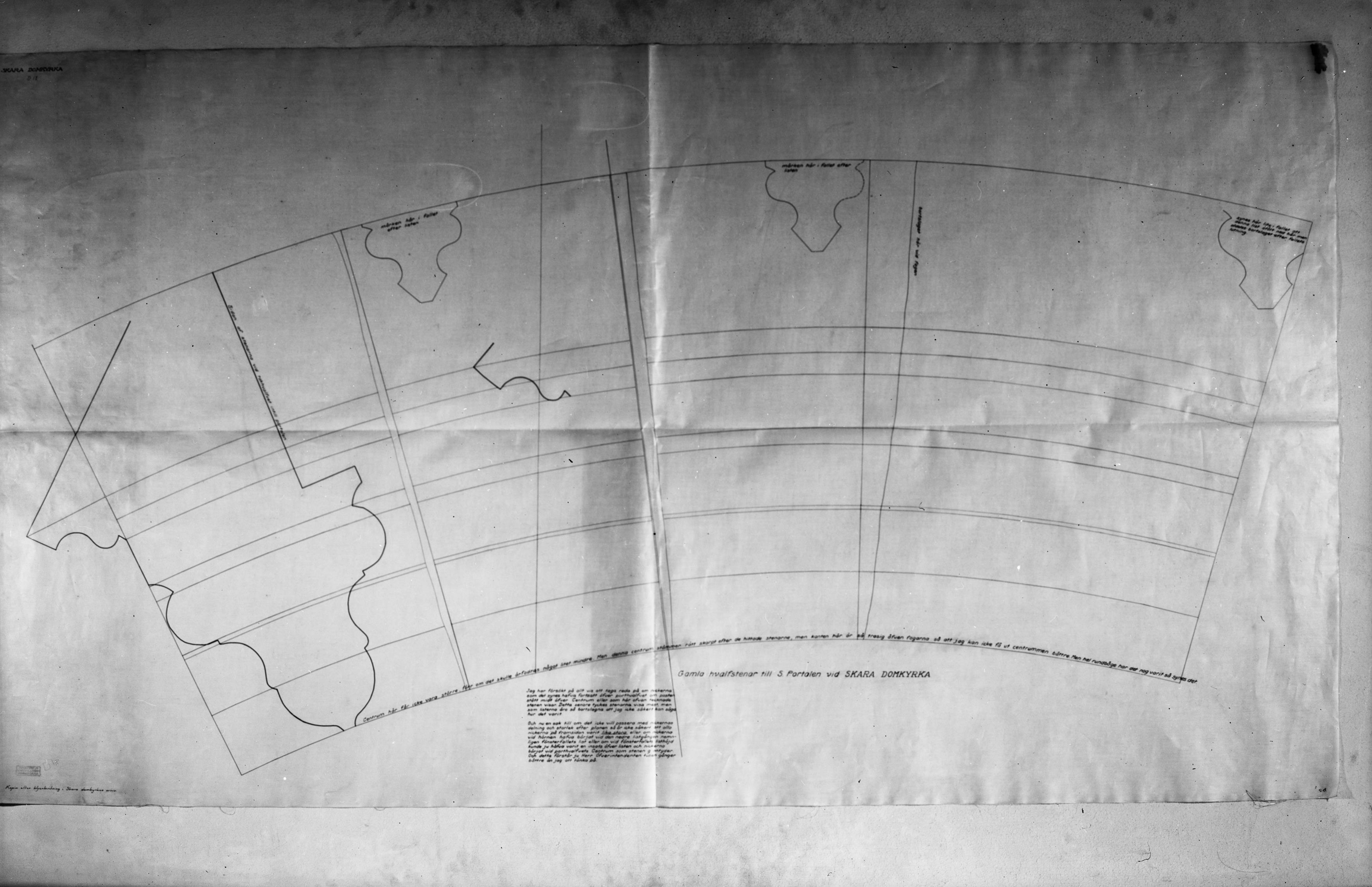 Beskrivning: Gamla valvstenar till södra portalen. Foto efter ritning.