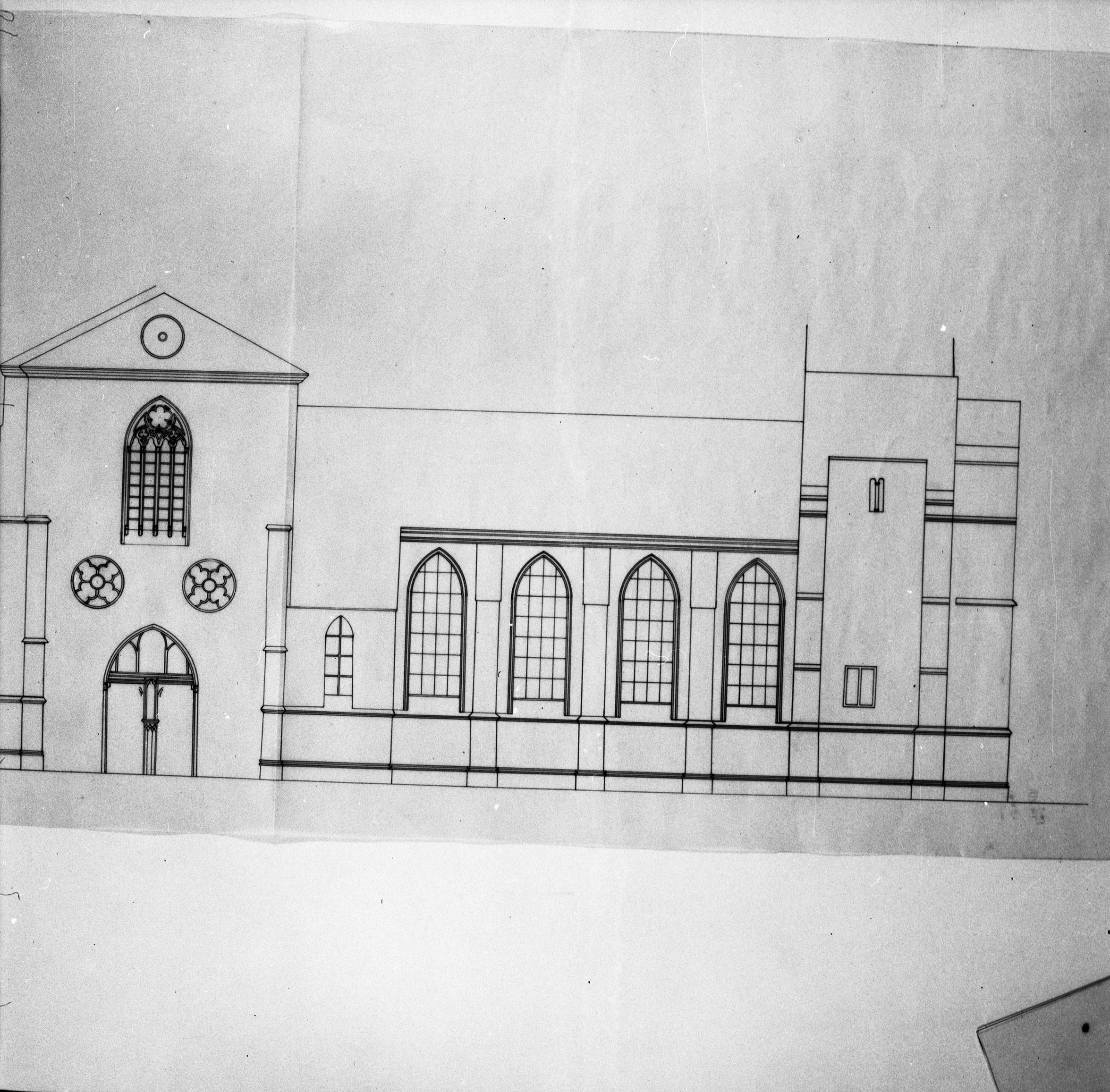 Beskrivning: Norra fasaden, västra delen. Före restaureringen. Foto efter ritning.