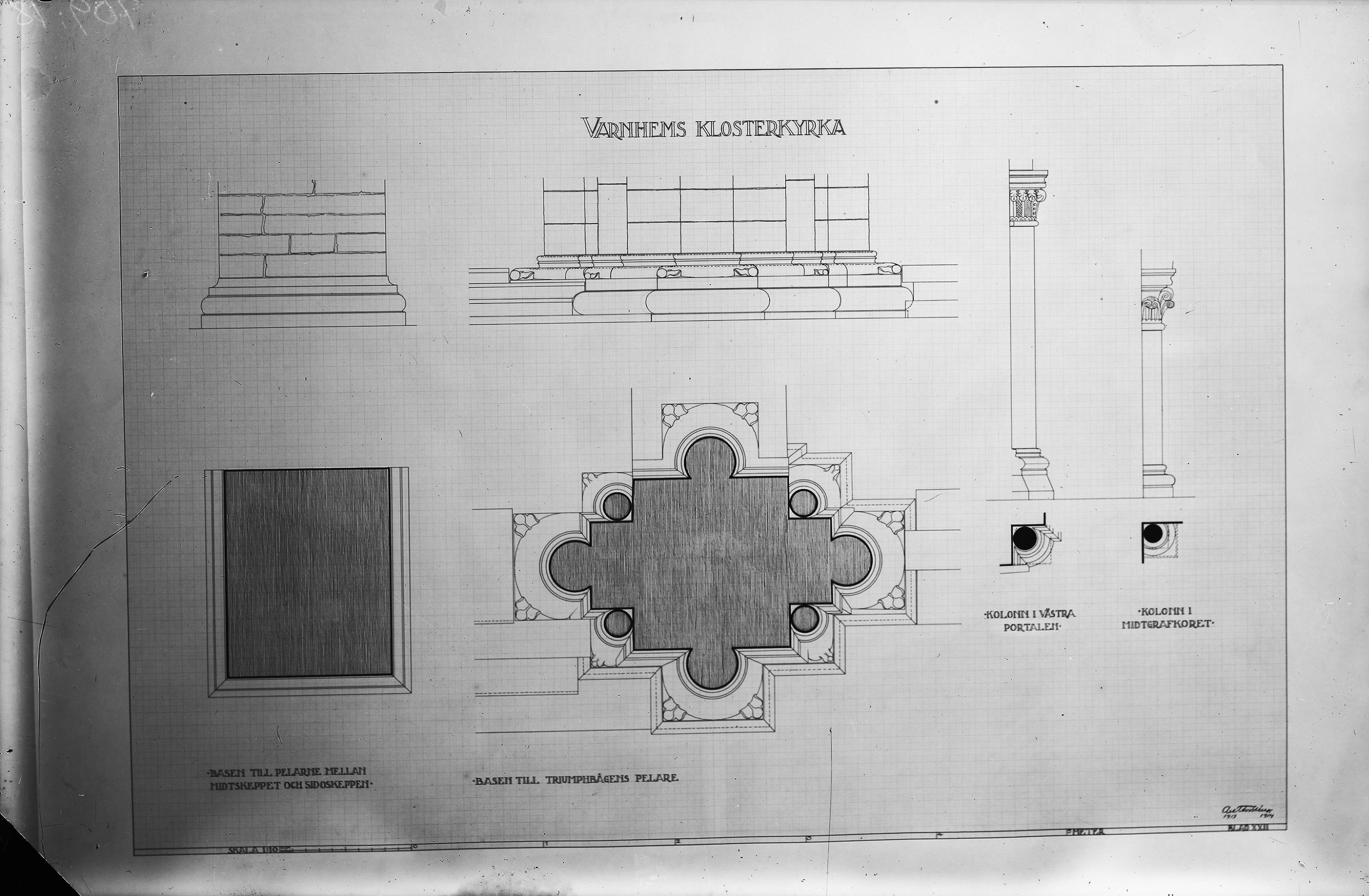 Beskrivning: Ritning av Axel Forssén, baser till pelare samt kolonner, avfotograferad.