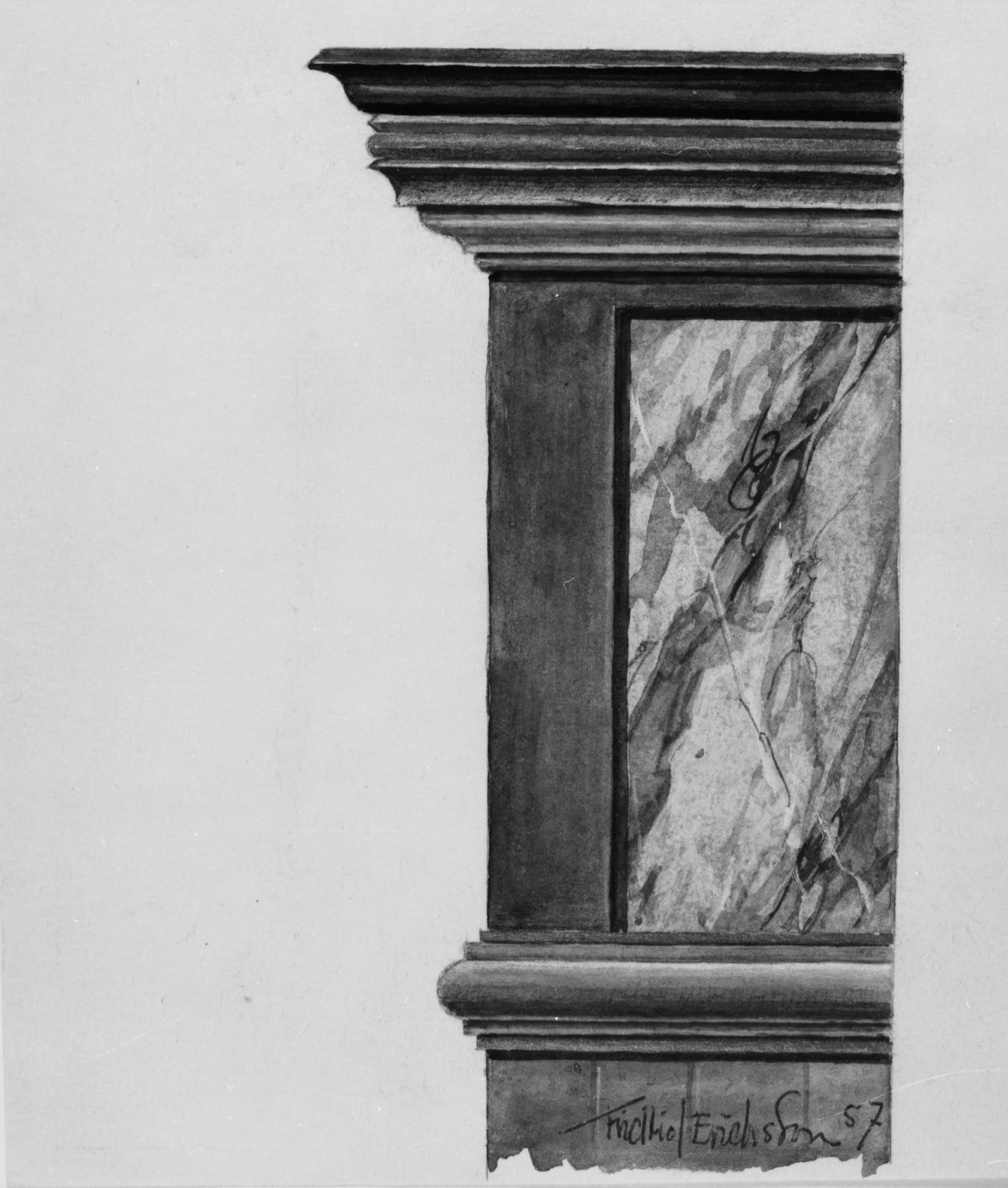 Beskrivning: Predikstol, detalj. Foto av teckning, utförd av konservator Fridtiof Erichsson, 1957.