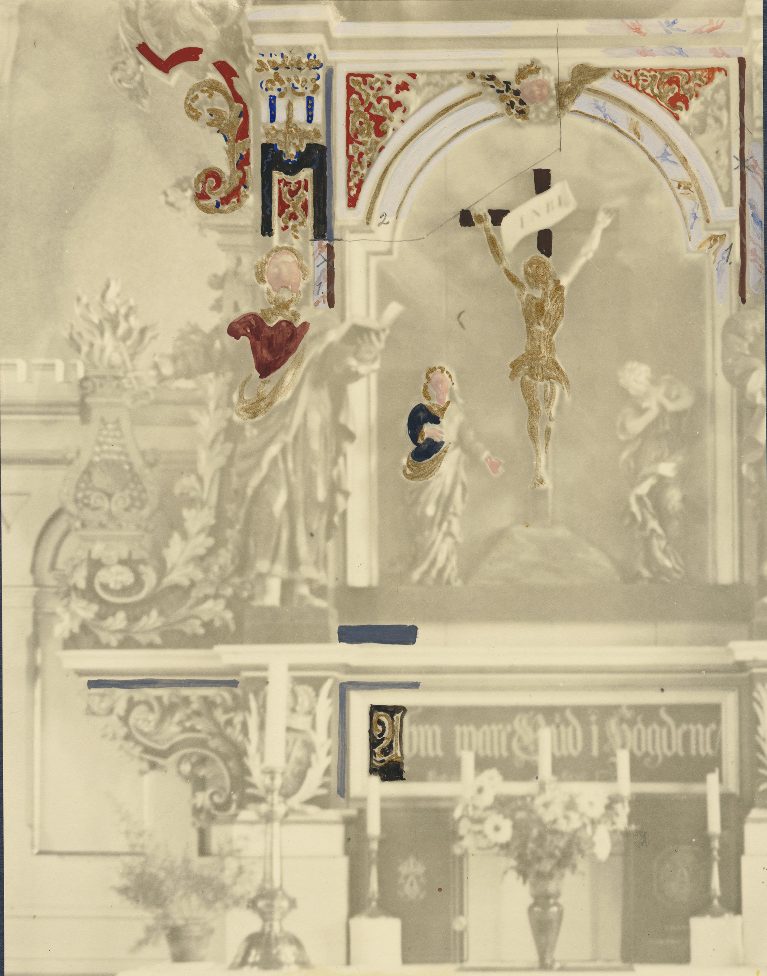 Beskrivning: Altaruppsats, 1726, av Nils Killman, detalj av det nedre partiet. Färglagt foto.