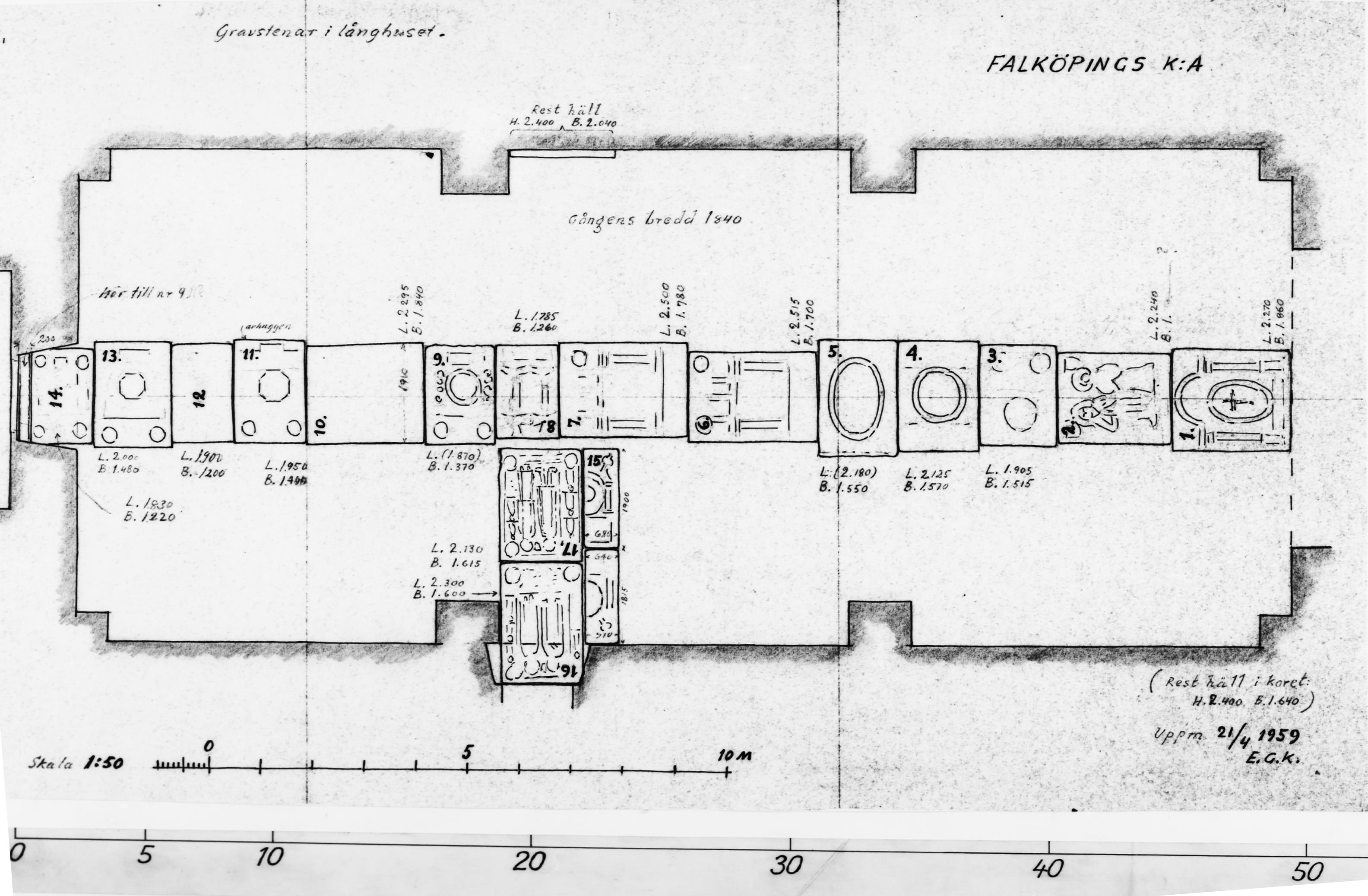 Beskrivning: Foto efter skiss över var gravhällarna påträffades 1959.