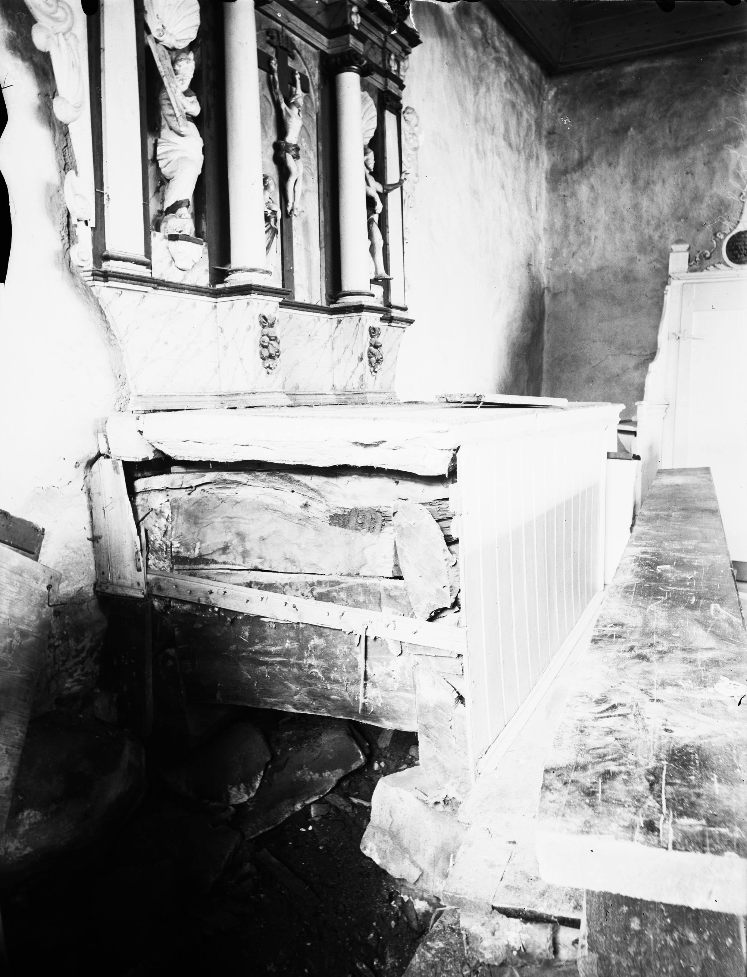 Beskrivning: Altaret sett från sidan. Under restaurering.