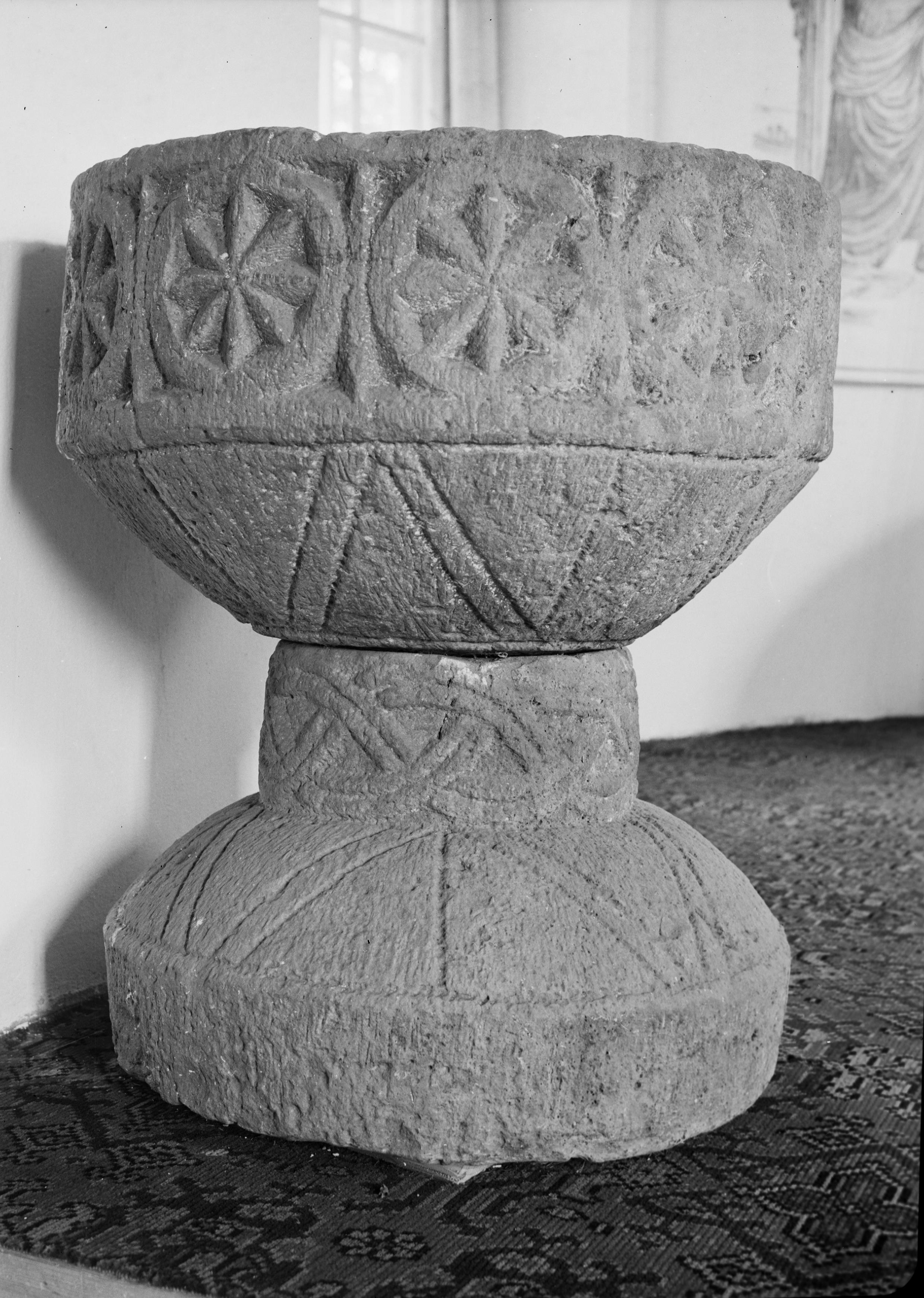 Beskrivning: Dopfunt av sandsten, 1200-talet. (Vid slutet av 1800-talet stod den utanför Fänneslunda gamla kyrkas (kyrkoruin) portal.)