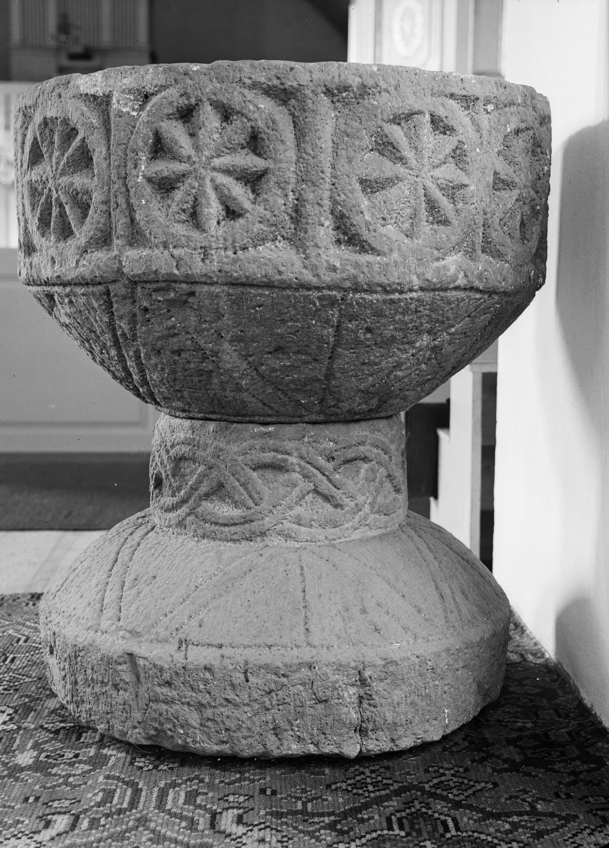 Beskrivning: Dopfunt av sandsten, 1200-talet. (Vid slutet av 1800-talet stod den utanför Fänneslunda gamla kyrkas (kyrkoruin) portal.)