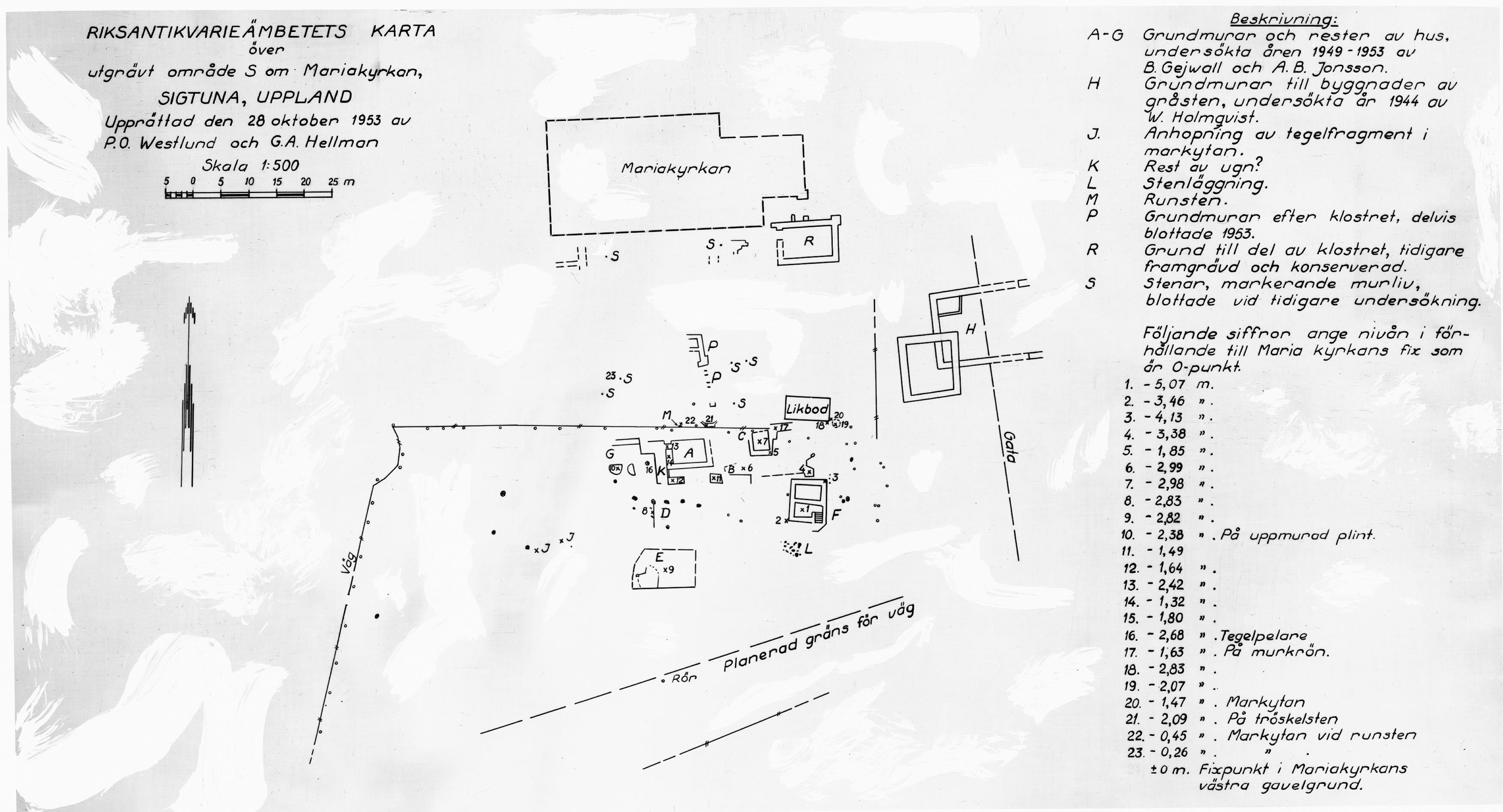 Beskrivning: Karta över utgrävning kring kyrkan, 1953. Foto efter karta.
