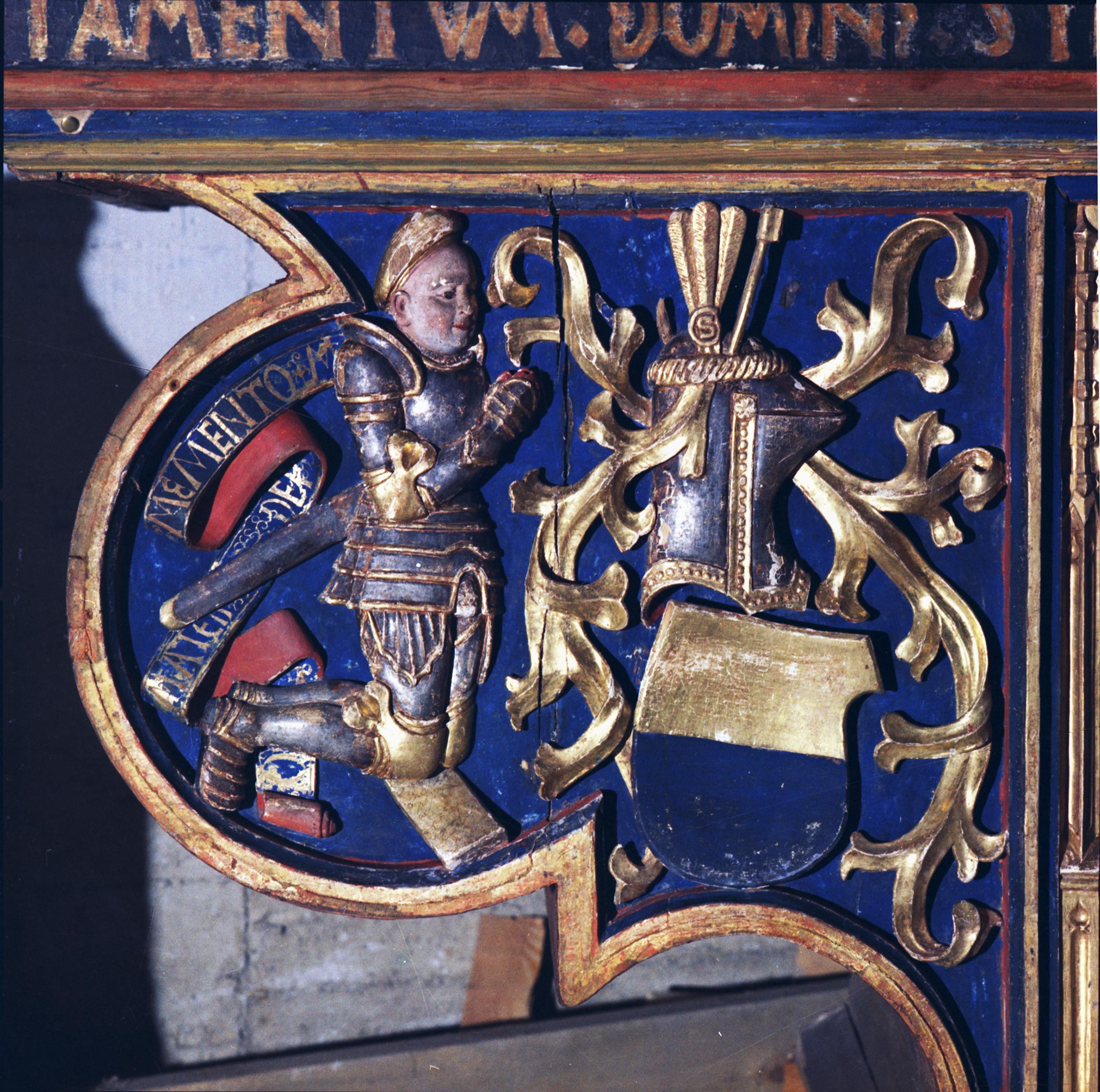 Beskrivning: Altarskåp, det s.k. Stureskåpet. Understycket med donatorn, Sten Sture d.y. knäböjande framför sin vapensköld.