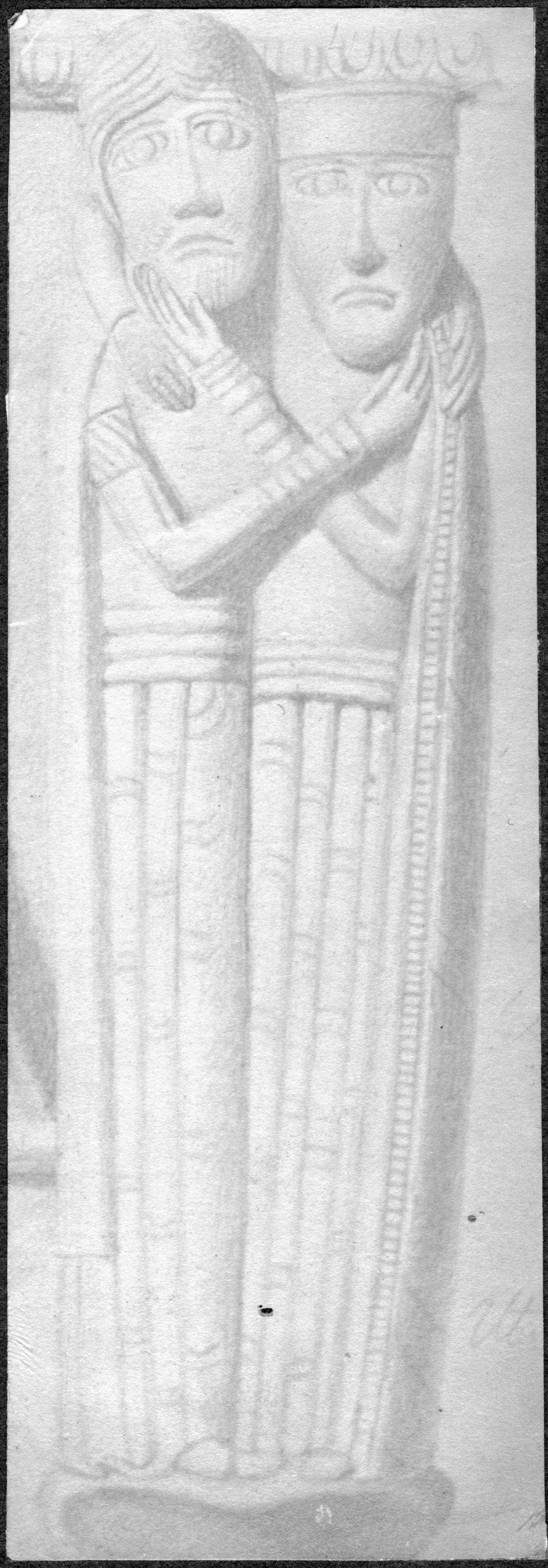 Beskrivning: Dopfunt av sandsten. Medeltida. Detalj, foto av teckning.