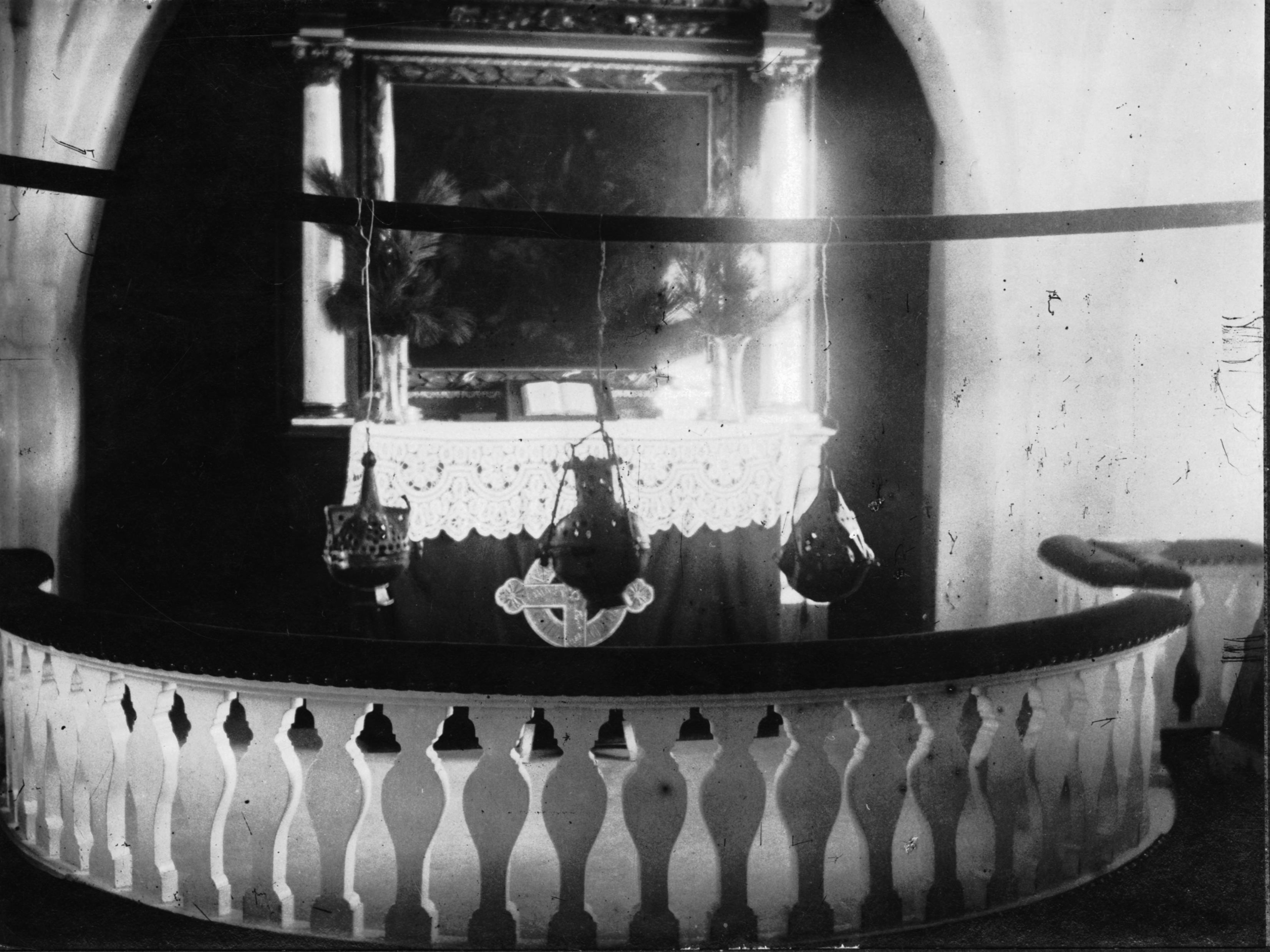 Beskrivning: Altare, med rökelsekaren tillfälligt upphängda, de hänger annars på ömse sidor, om krucifixet i triumfbågen. Det ena tillhör Önnarp kyrka.