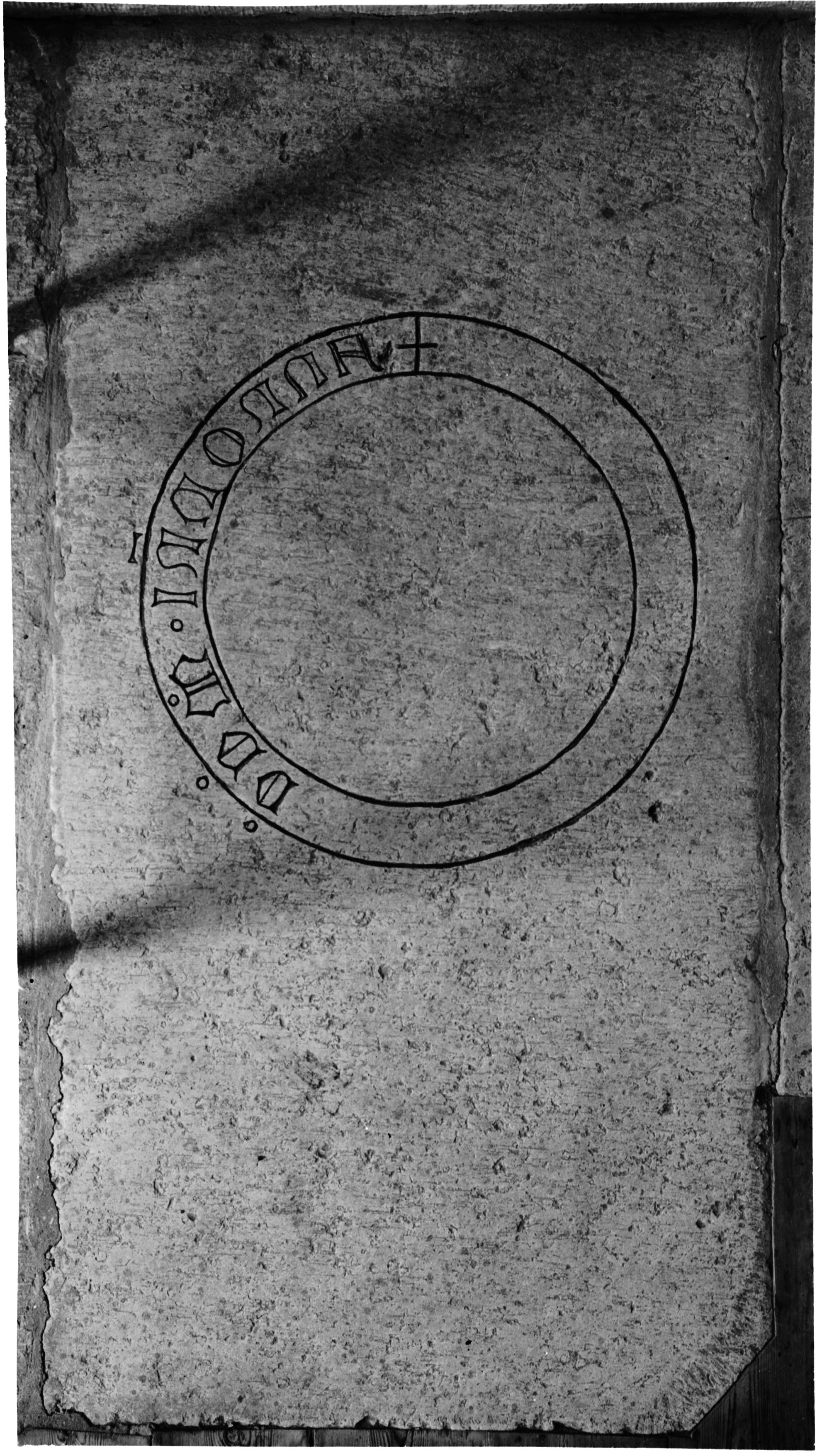 Beskrivning: Gravhäll. I golvet framför altaret.
