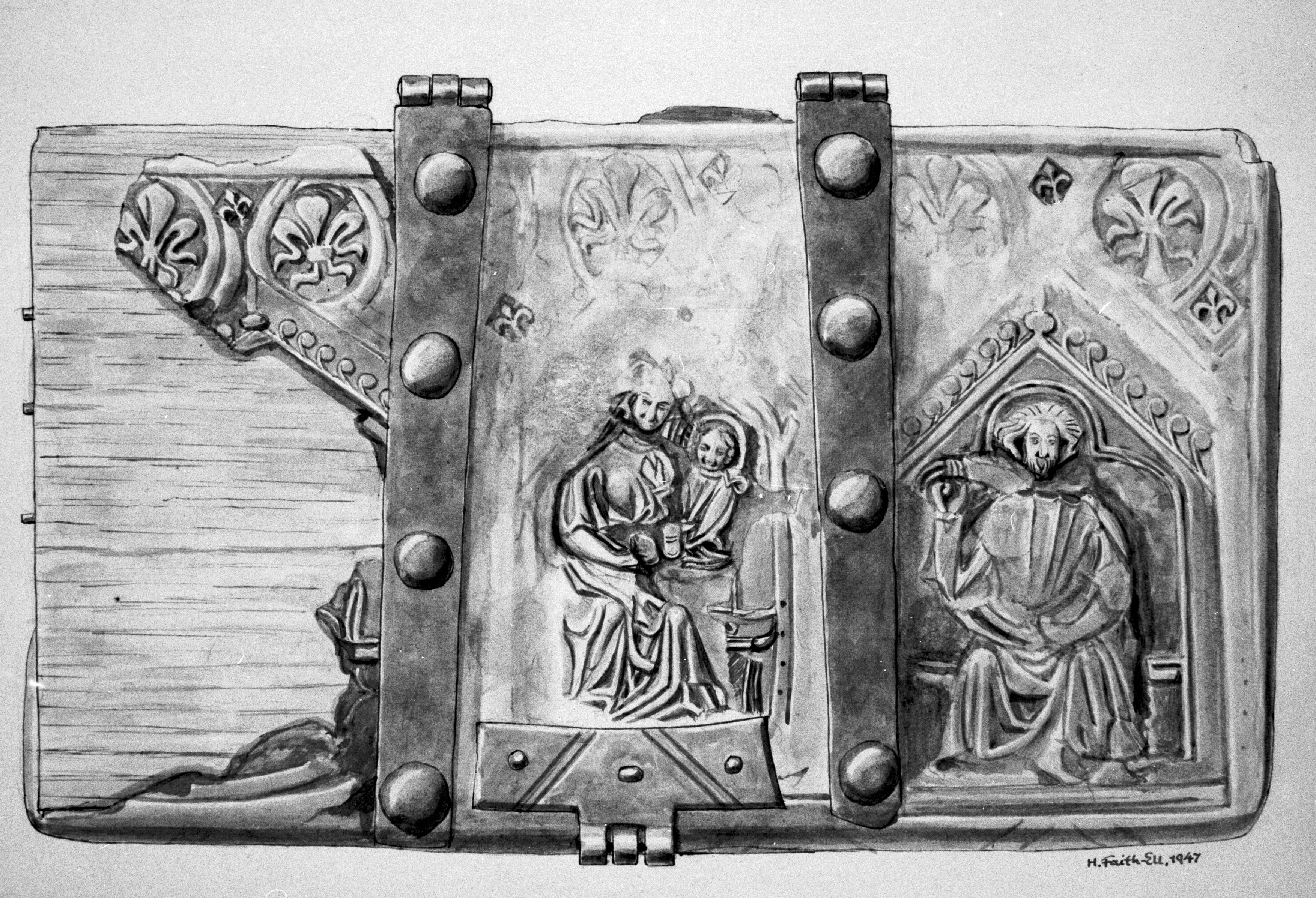 Beskrivning: Foto av teckning av Harald Faith-Ell 1947, läderbeklätt skrin av ek med järnbeslag. Original i Handteckningssamlingen, ATA.