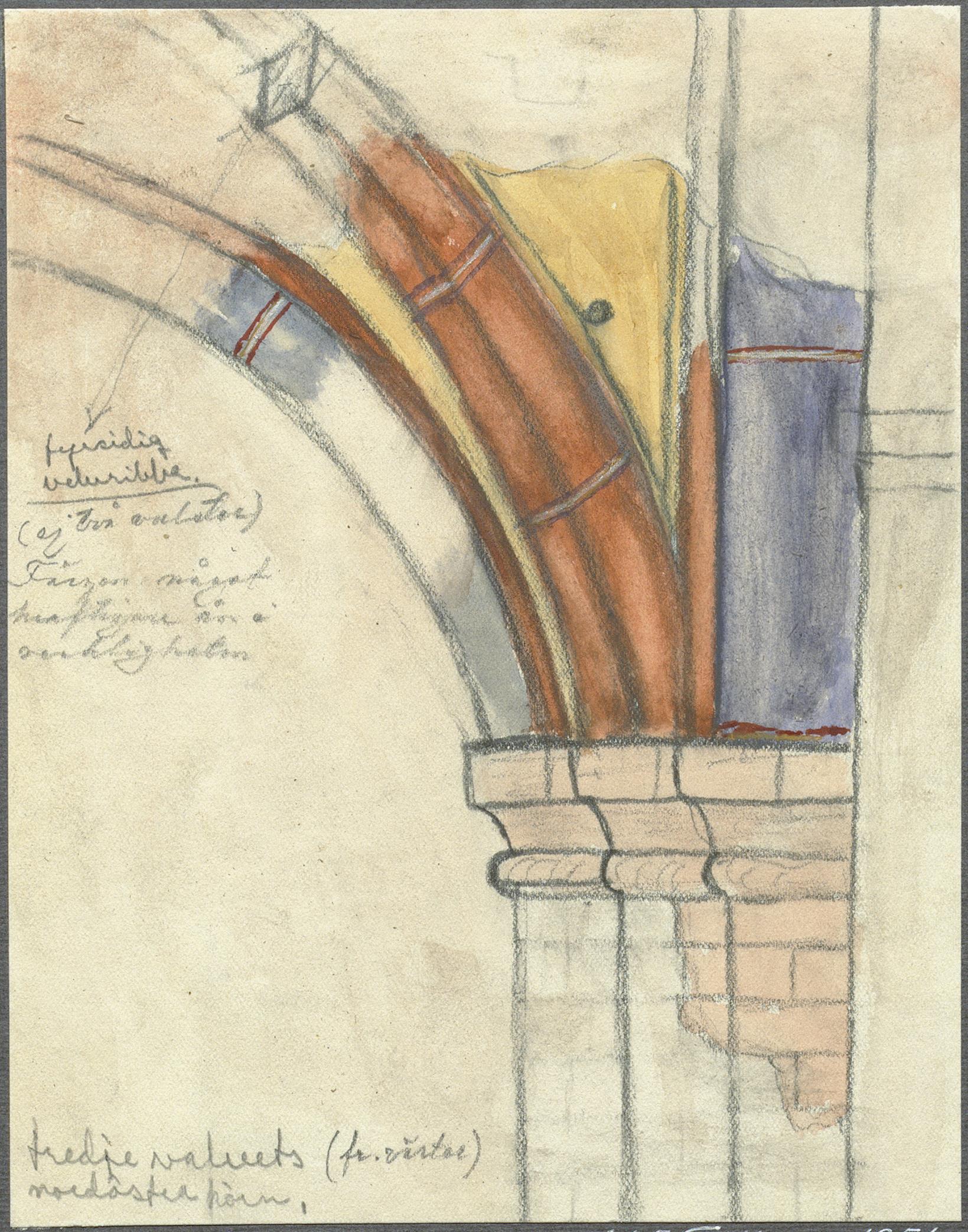 Beskrivning: Valvribbor i långhuset med färgspår. Akvarell av konservator U Wihlborg 1954.