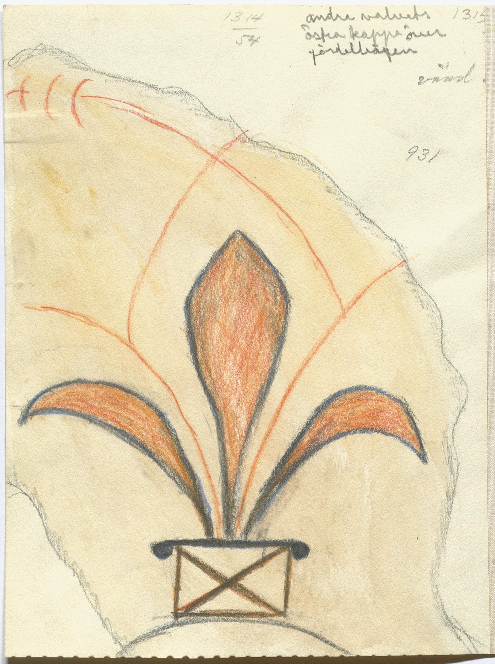Beskrivning: Färgspår i en valvkappa i långhuset, visar bl a en fransk lilja. Akvarell av konservator U Wihlborg 1954.
